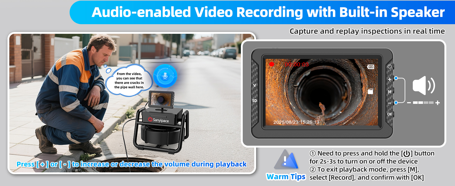 • ★[تسجيل فيديو وصوت عالي الدقة] تسجل كاميرا فحص المجاري المدمجة والقوية فيديو وصوت عالي الدقة متزامنين، مما يجعل كل مشكلة في الأنابيب مرئية بوضوح. يلتقط Borescope صورًا قريبة فائقة الوضوح للتفاصيل المهمة مثل الشقوق والتآكل والمفاصل.