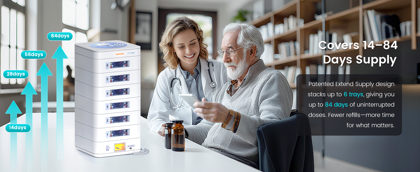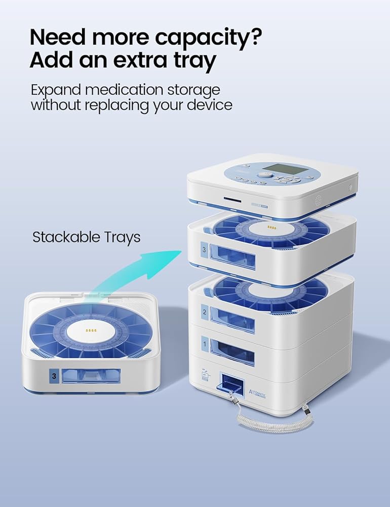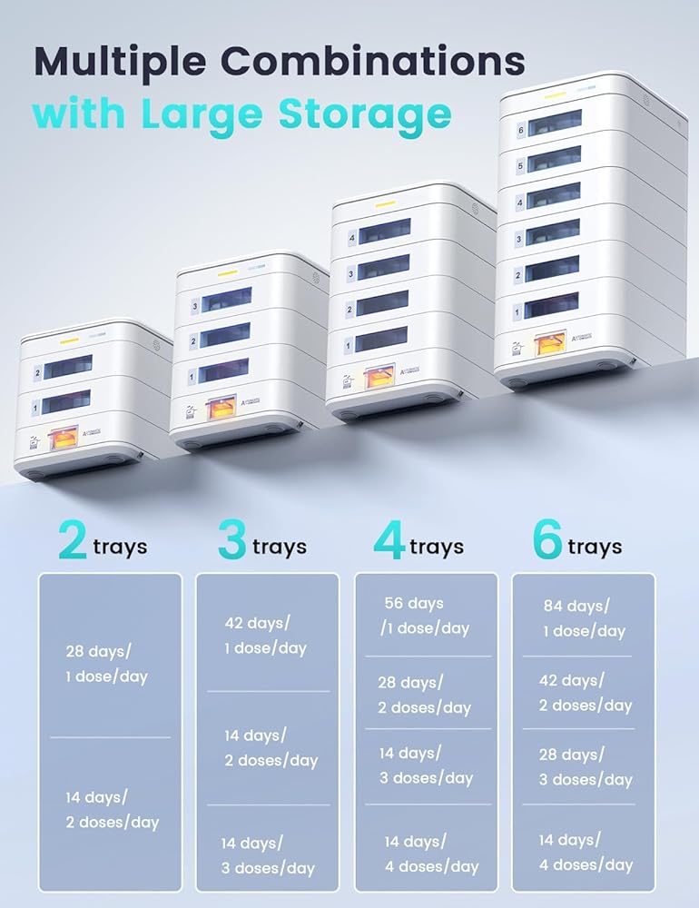 موزع حبوب الدواء التلقائي لمدة 56 يومًا (1X) (صينية قابلة للتوسيع) - إعداد التطبيق وعلى الجهاز حسب العائلة، شاشة LCD، قفل رقمي، تنبيهات الصوت والضوء - منظم أدوية آمن لكبار السن الذين يعانون من الخرف (4-صينية، أبيض)