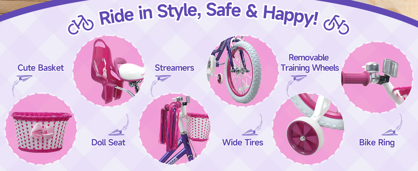 Is your 2-9 year old ready to zoom into outdoor adventures? Meet the Winhope Girls Bike—designed just for her with vibrant, playful colors (like the cheerful pink & rainbow details she'll squeal over) and all the cute, functional extras she'll love. Imagine her grinning as she rides with her favorite doll in the dedicated doll seat, stows snacks in the basket, and watches the fluffy streamers dance in the breeze. This isn't just a bike—it's a ticket to endless backyard, park, and neighborhood fun! But it's not all about cuteness: we built this beginner-friendly ride to keep her safe (dual brakes! enclosed chain guard!) and grow with her (adjustable saddle/handlebar!). Plus, with 95% pre-assembled parts, she can start riding 10-15 minutes after unboxing. Ready to give her a gift that blends joy, safety, and adventure? Keep to find her right size!