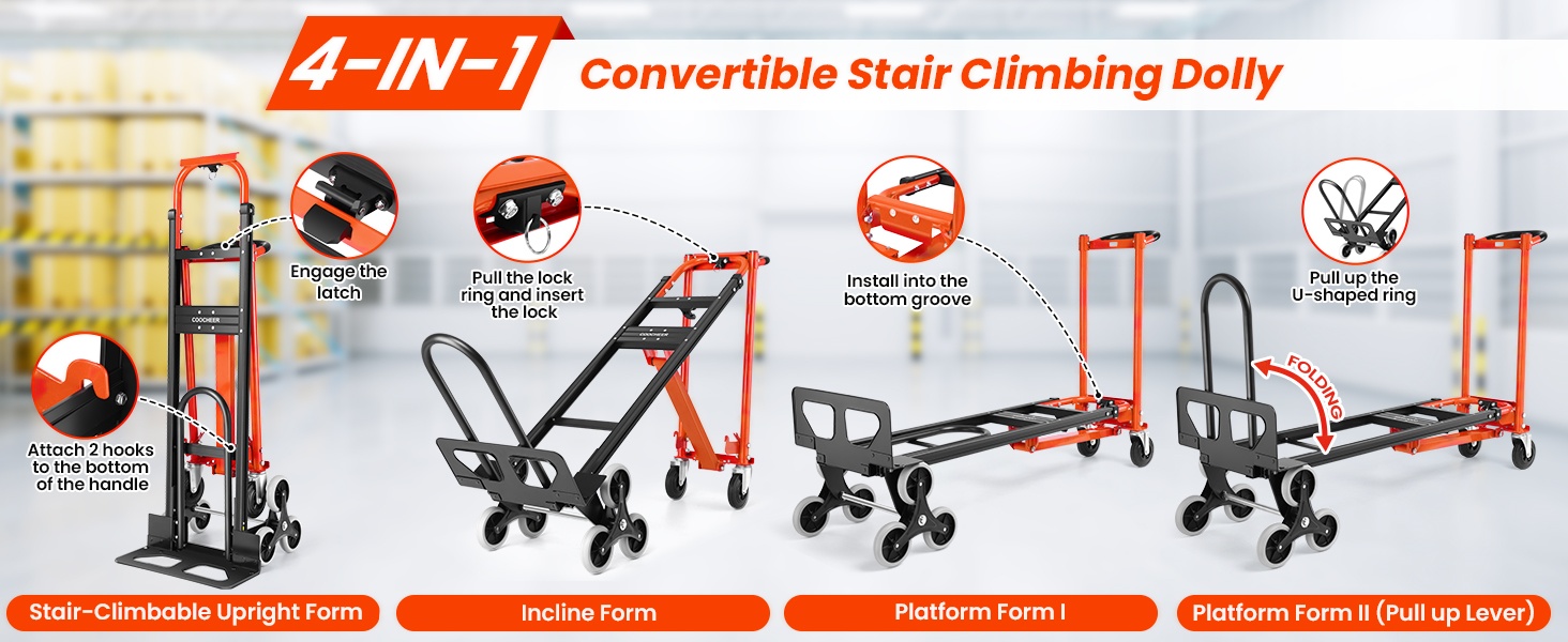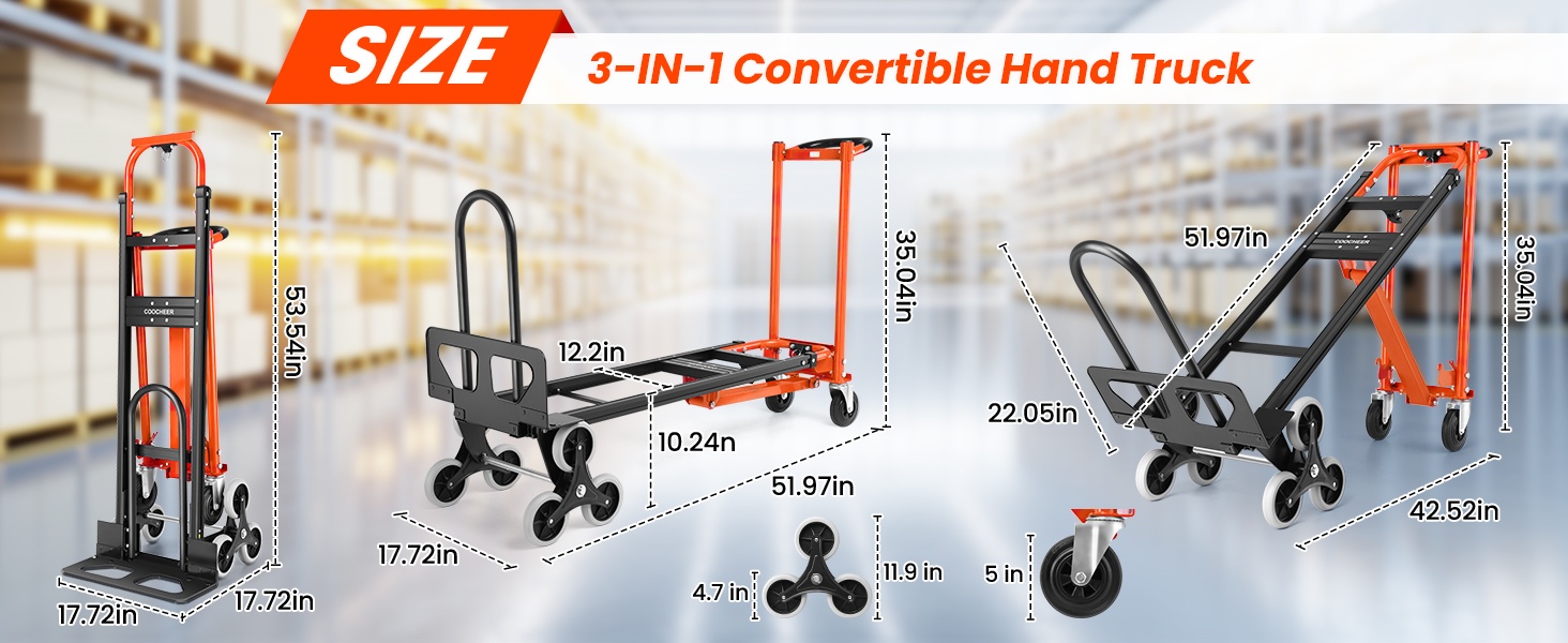 【شاحنة يدوية متعددة الأغراض 3 في 1】تتميز هذه الشاحنة اليدوية القابلة للطي بتصميم متعدد الاستخدامات يتحول بسهولة من عجلتين في وضع مستقيم إلى تكوين أفقي بأربع عجلات دون الحاجة إلى مسامير أو براغي، وتوفر 3 أوضاع قابلة للتعديل للتكيف بسلاسة مع جميع متطلبات النقل الخاصة بك. إنه يعمل كوضع مستقيم بعجلتين مثالي للنقل الرأسي (مثل الأجهزة الطويلة مثل الثلاجات)، ووضع عربة بأربع عجلات مثالي للأحمال الثقيلة اليومية (مثل نقل الصناديق أو الأثاث الصغير)، ووضع منصة بأربع عجلات ممتاز للعناصر كبيرة الحجم (مثل الأرائك أو العبوات الكبيرة) - كل ذلك بدون أدوات إضافية لتوفير الوقت والجهد في كل حركة.