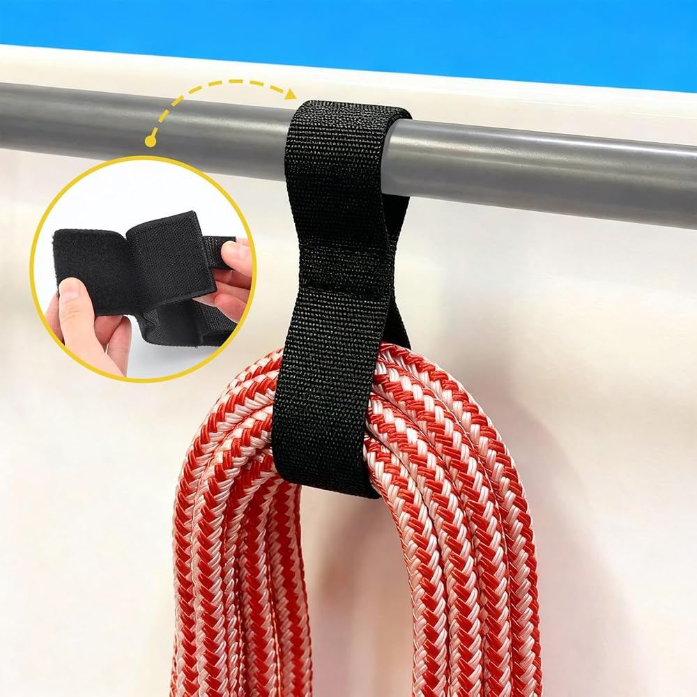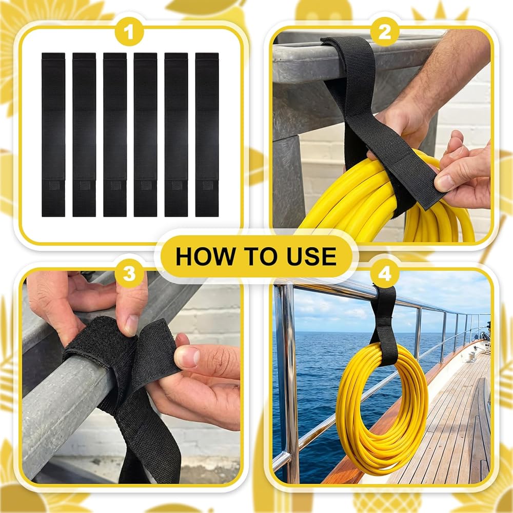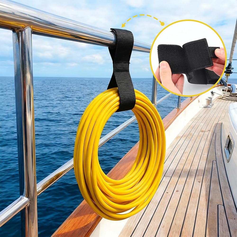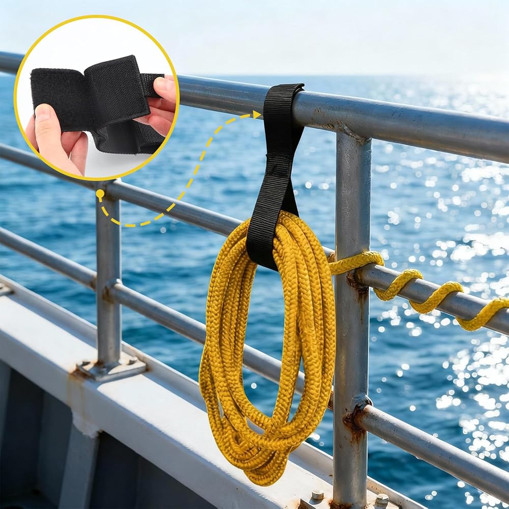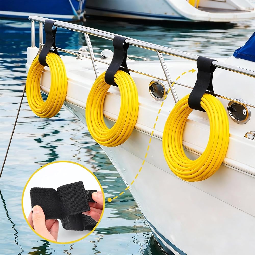 Unique Design: the sturdy and durable boat railing line straps storage features adhesive closures at both ends, allowing for adjustable length to accommodate different rope thicknesses; And they can be also easily secured to boat railings, stanchions, hooks, and other locations, providing a secure and reliable hold