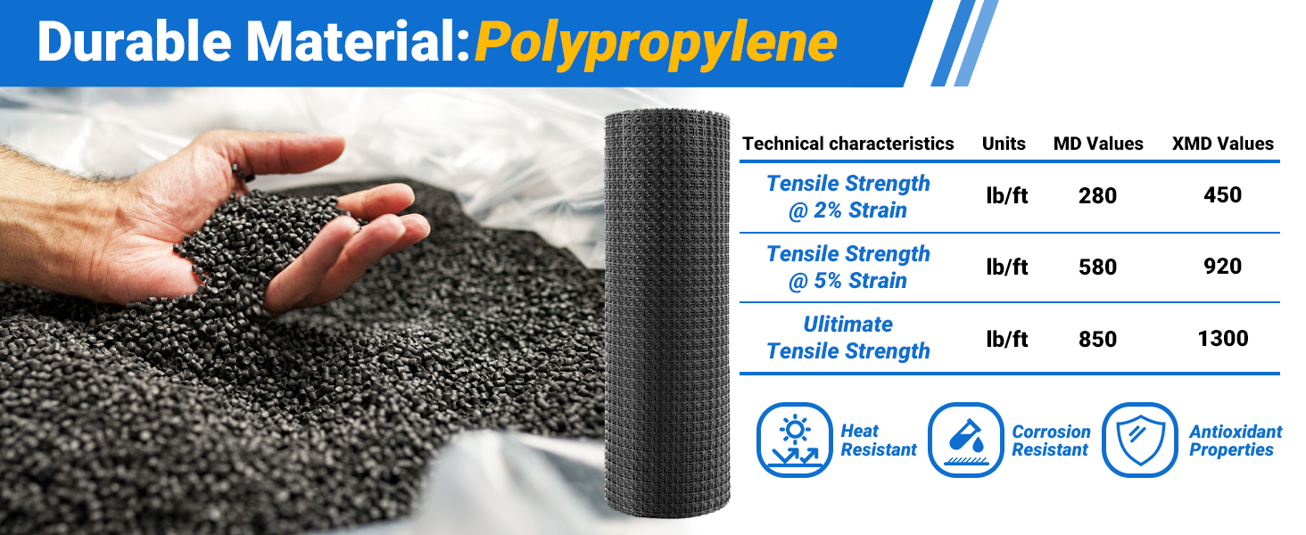 DURABILITY: Geogrid for retaining wall is made of high-quality polypropylene, offering 100% UV and chemical resistance. It withstands photooxidation, acids, and alkalis, ensuring durability and stability in all climates.