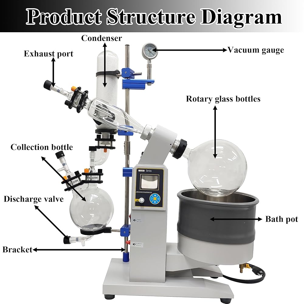 • [STRONG APPLICABILITY]The 5L rotary evaporator with pressure gauge can be used with circulating water type multi-purpose vacuum pump, diaphragm vacuum pump, low temperature cycle (vacuum) pump, circulating cooler, constant temperature cycle, low temperature coolant circulation pump and other ancillary components of the system