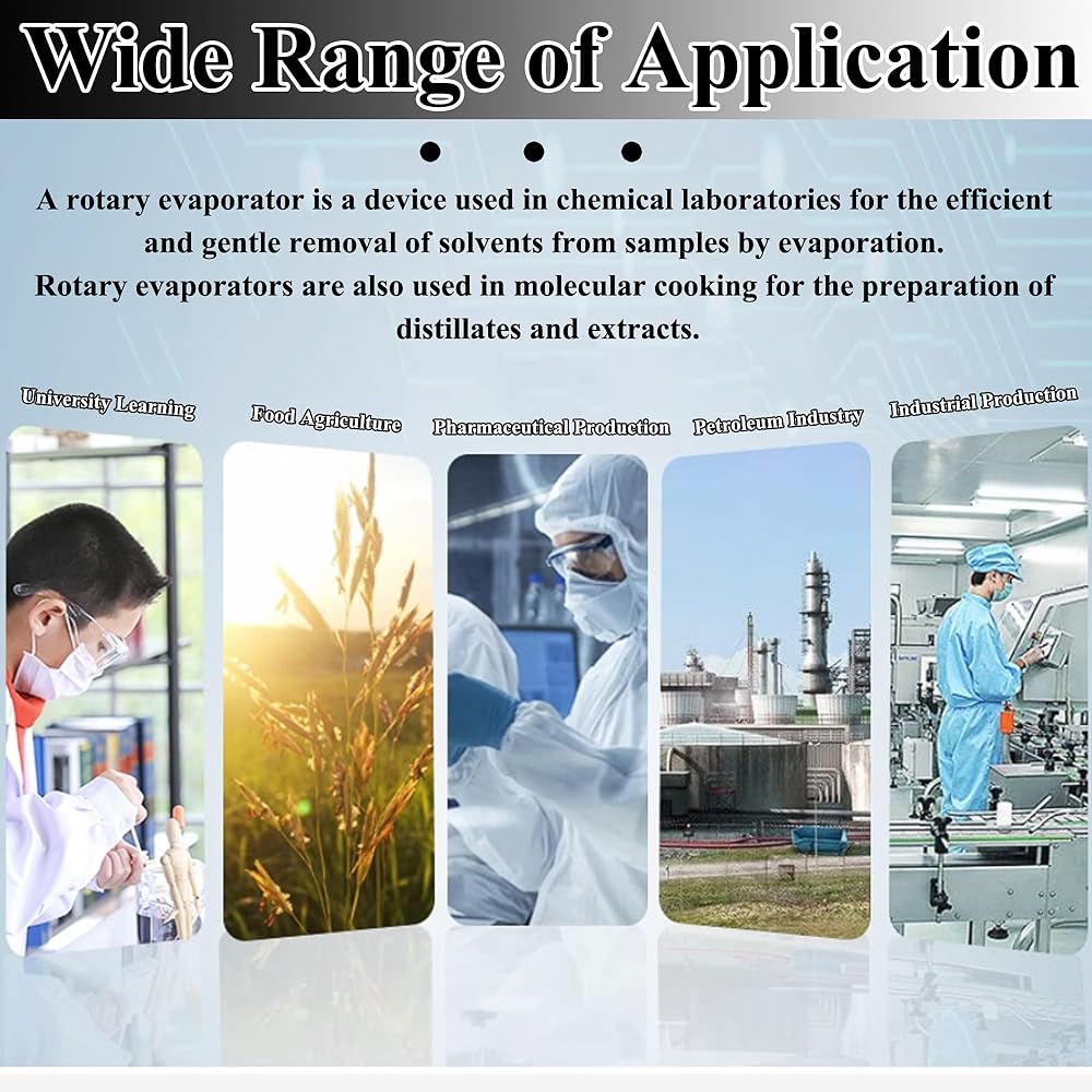 • [PRACTICAL LABORATORY EQUIPMENT]A rotary evaporator is a laboratory device used for the continuous distillation of large quantities of volatile solvents under reduced pressure. Has a large capacity, large caliber rotary evaporation bottle, placed in a water bath, rotate the heating, so that the solution of diffusion efficient evaporation