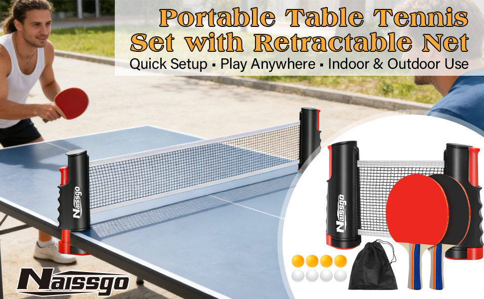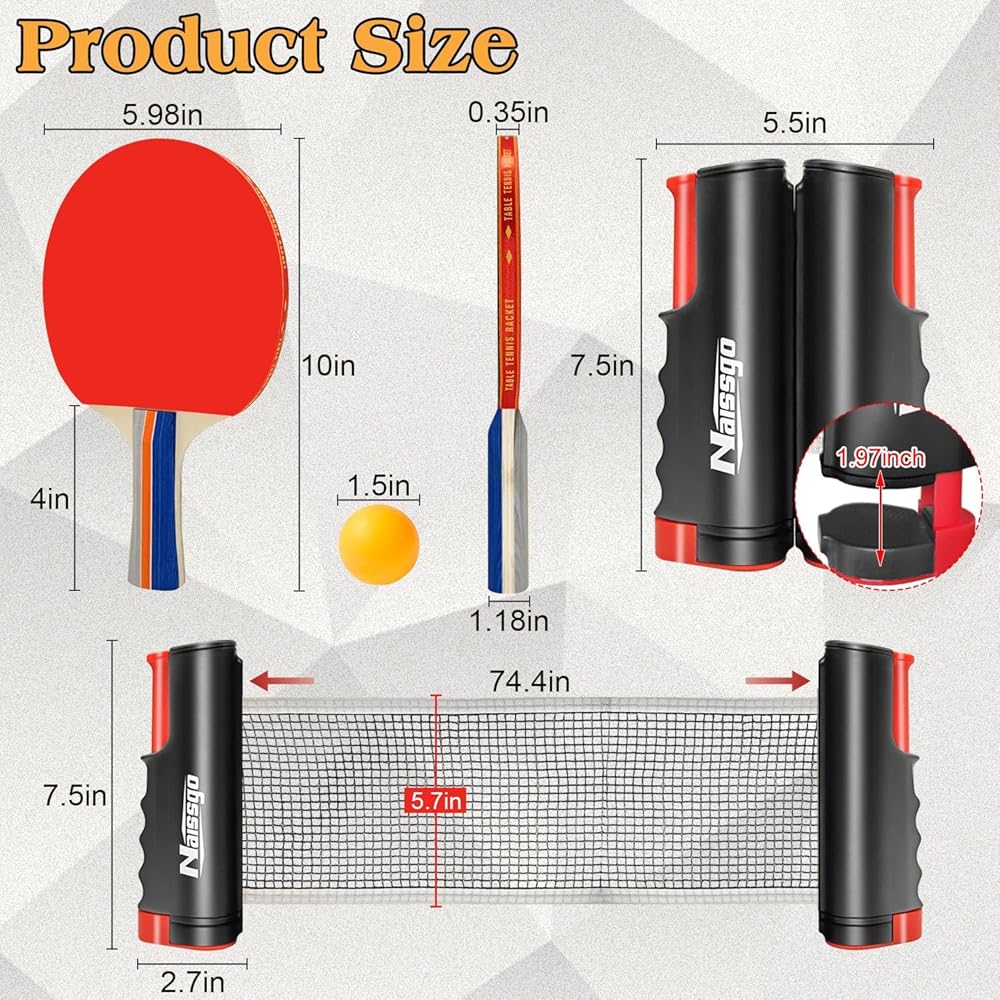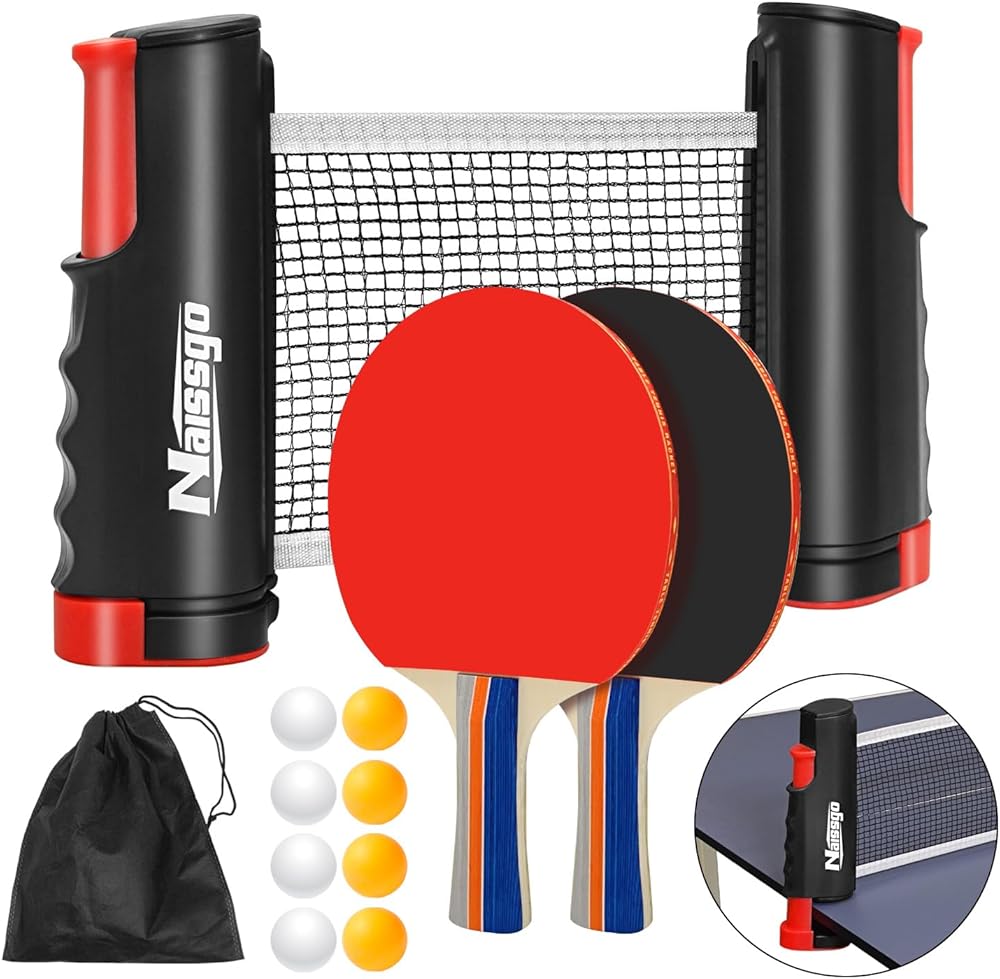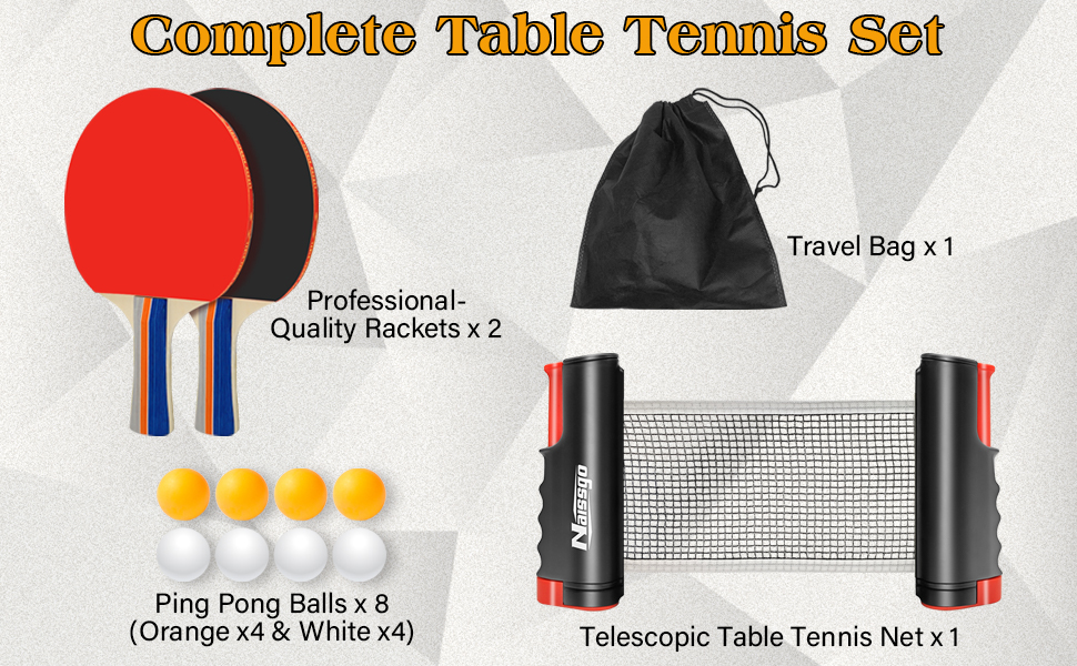 مجموعة تنس الطاولة الكاملة - تتضمن مجموعة تنس الطاولة المحمولة هذه مجدافين بينج بونج و6 كرات بينج بونج وشبكة تنس طاولة قابلة للسحب وحقيبة حمل شبكية. كل ما تحتاجه للإعداد السريع واللعب الفوري في المنزل أو المكتب أو في الهواء الطلق.