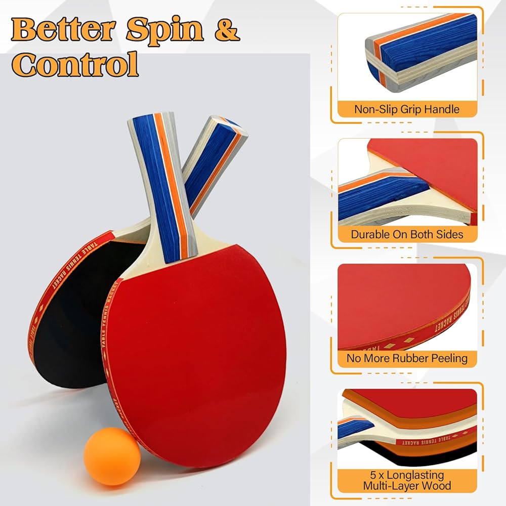 مجاديف عالية الجودة - المضارب مصنوعة من الخشب طويل الأمد مع سطح مطاطي عالي المرونة لتحسين السرعة والدوران والتحكم، مما يوفر تجربة لعب سلسة للمبتدئين ولاعبي تنس الطاولة.