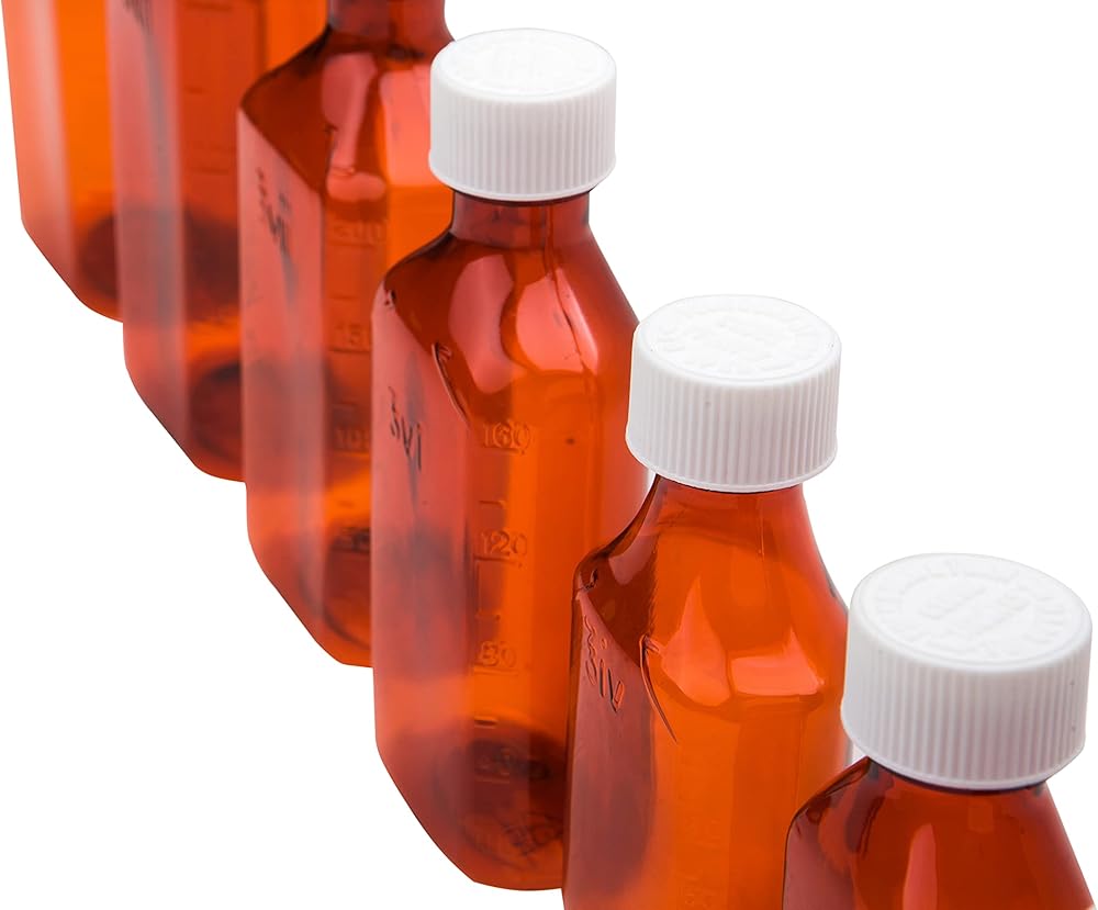 حاوية صيدلية العنبر مع غطاء - زجاجة قابلة لإعادة التعبئة مقاومة للدفع والدوران - حاوية دواء سائلة ووصفة طبية مقاومة للكسر مع خطوط قياس، 4 أونصة (200 قيراط)