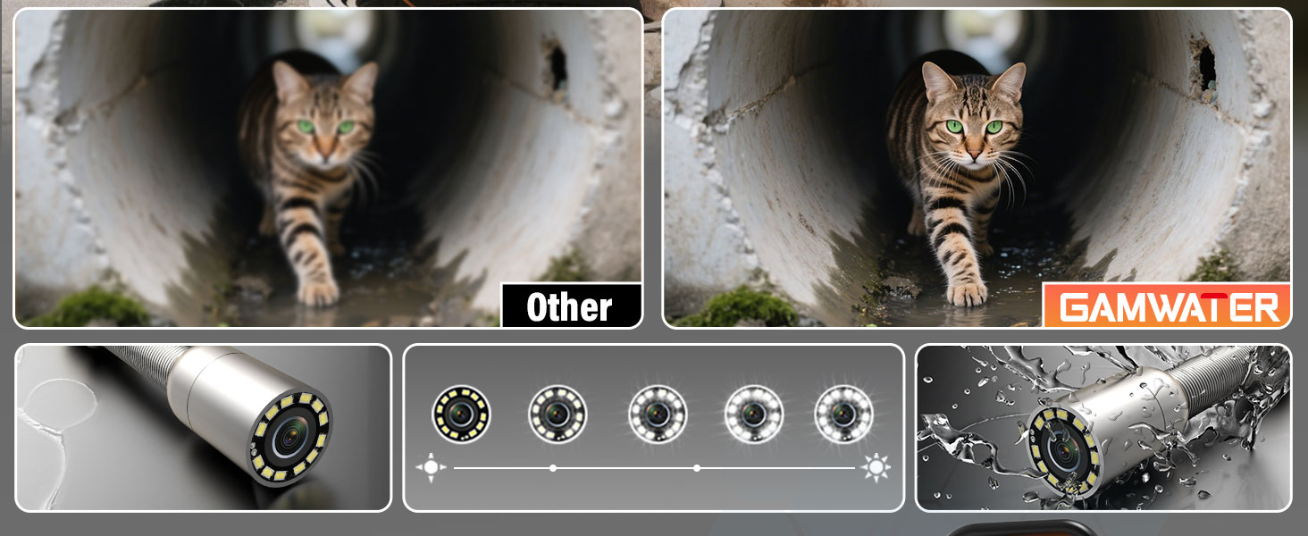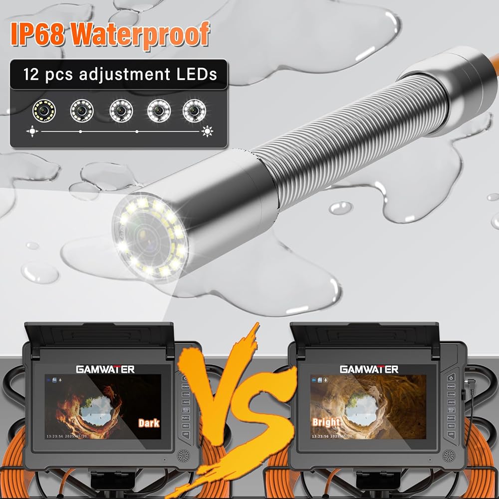 【كاميرا HD مقاومة للماء IP68】تم تجهيز نظام كاميرا GAMWATER Sewer بكاميرا بيكسل عالية الوضوح 23 مم وكاميرا 1080 بيكسل مع 12 مصباح LED يمكنها ضبط السطوع لإضاءة أنابيب الصرف الداكنة والمجاري، مما يجعلها أكثر ملاءمة للاستخدام. تتميز كاميرا فحص المجاري بزاوية رؤية تبلغ 145 درجة، مما يسمح لك برؤية كل شيء بوضوح في بيئة الاستخدام.