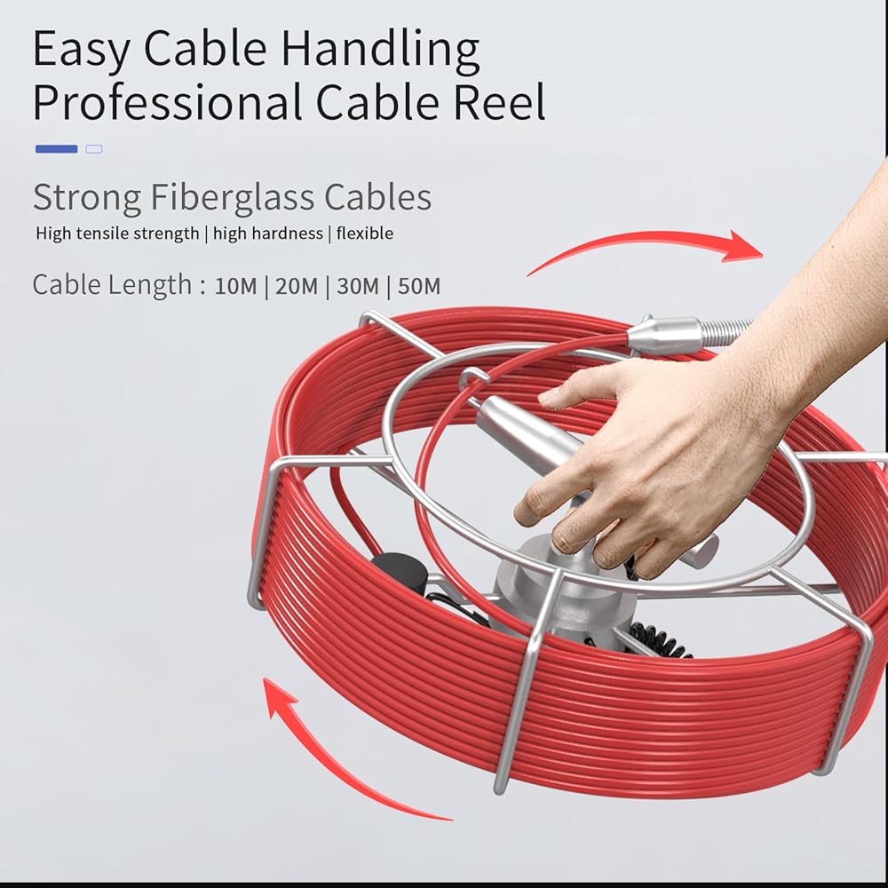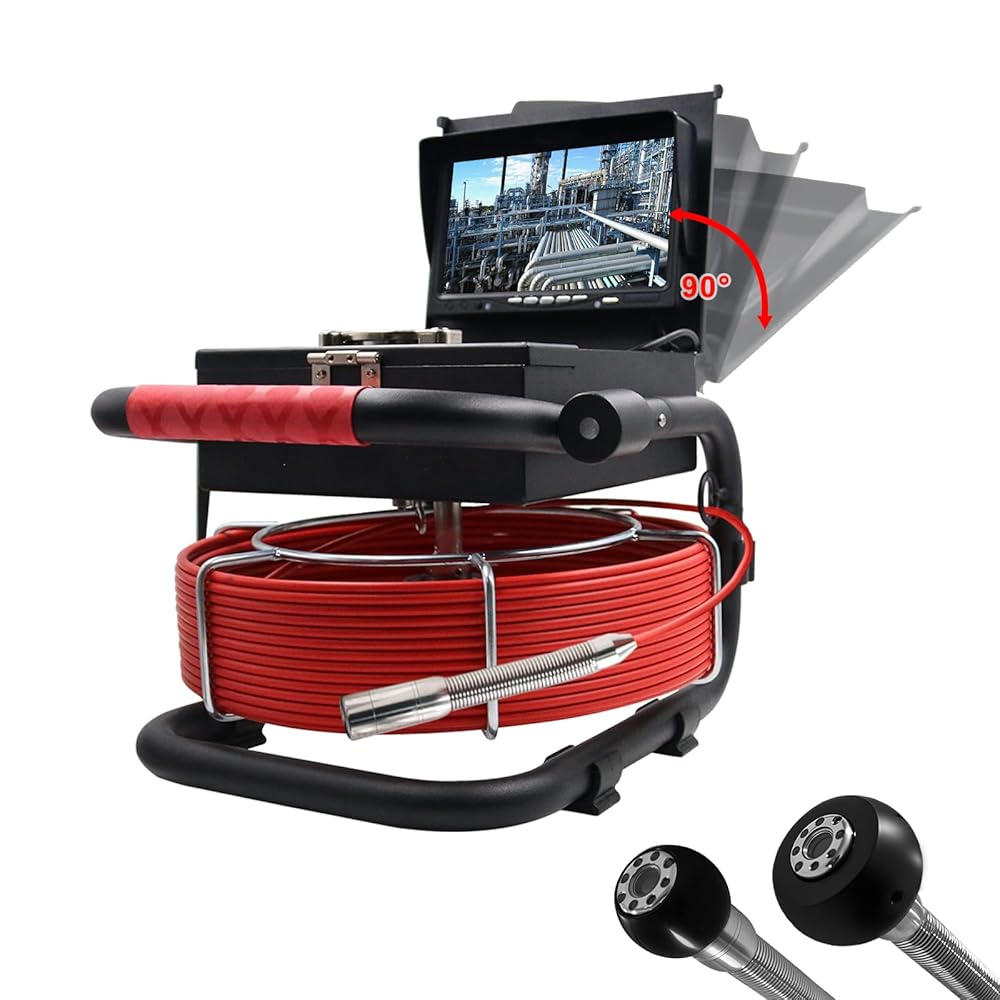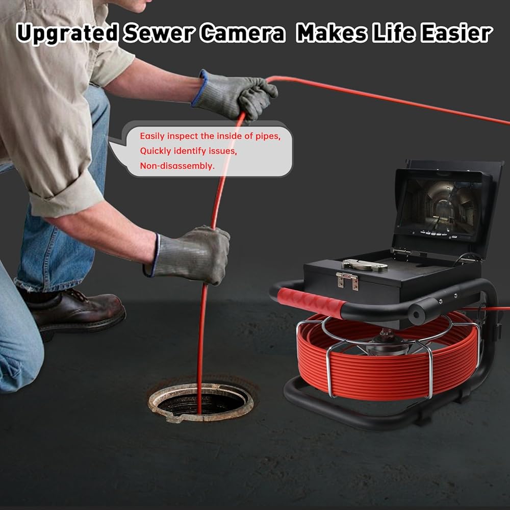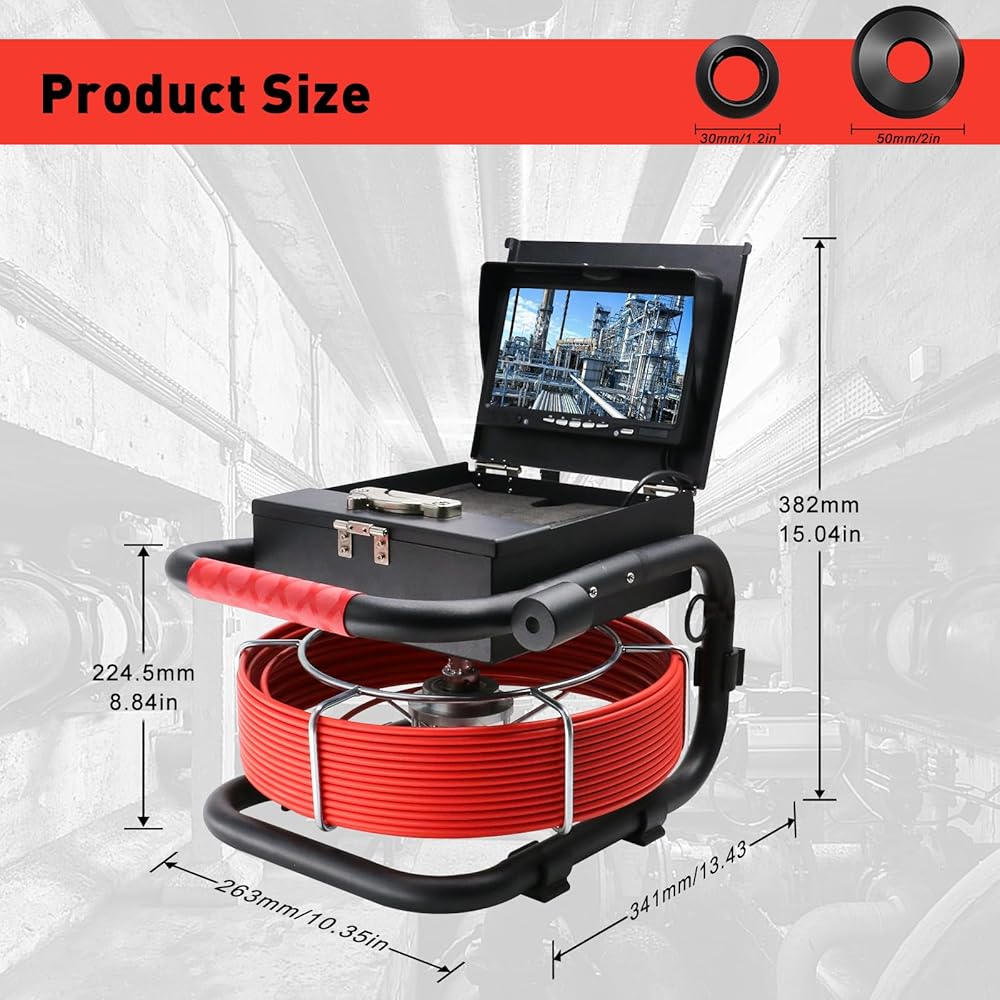 This 23mm pipe inspection camera easily navigates tight pipes like P-traps and S-bends. It features 4-level adjustable LED lights for clear viewing in dark spaces. The 1000TVL HD camera displays real-time video on a 7” color screen. With a 100ft waterproof cable and a long-lasting 5600mAh battery, it's perfect for home and professional use. Comes with a durable carrying case and ergonomic reel handle for easy transport.