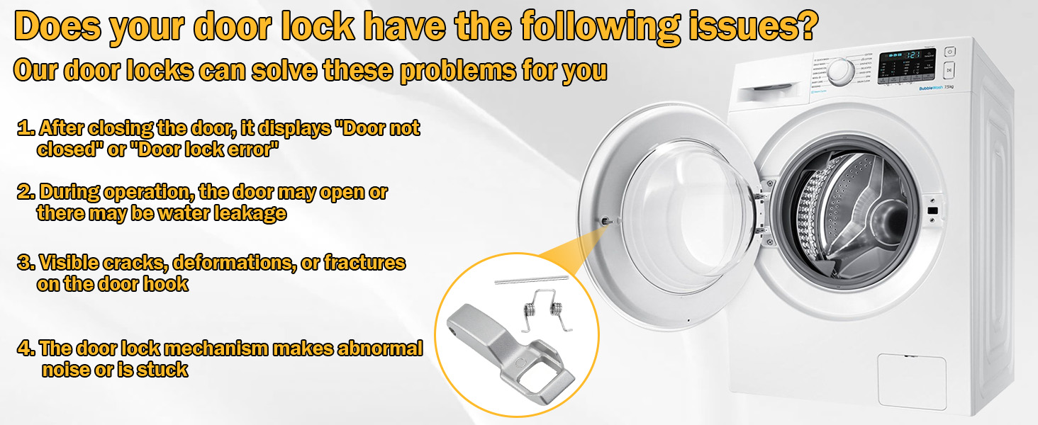 • Does your door lock have the following issues? Our door locks can solve these problems for you 1.After closing the door, it displays "Door not closed" or "Door lock error" 2.During operation, the door may open or there may be water leakage 3.Visible cracks, deformations, or fractures on the door hook 4.The door lock mechanism makes abnormal noise or is stuck