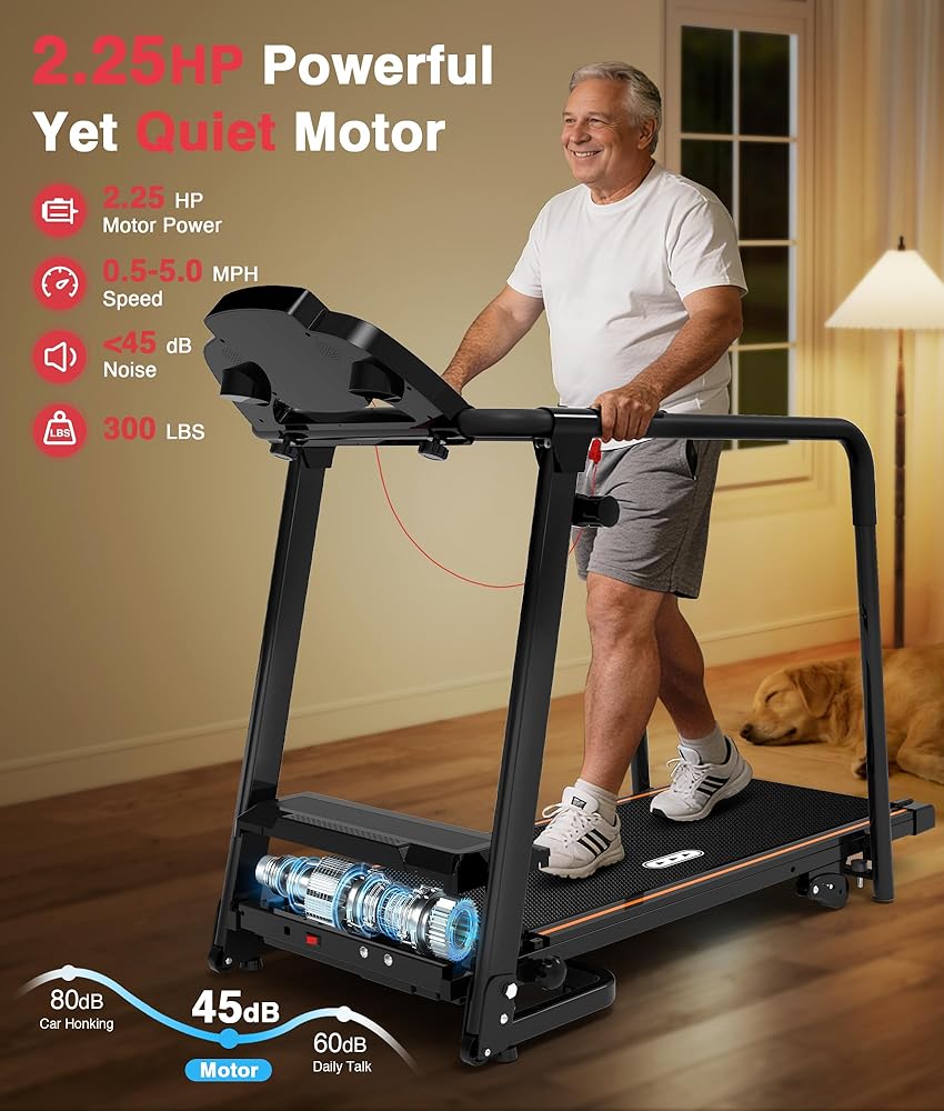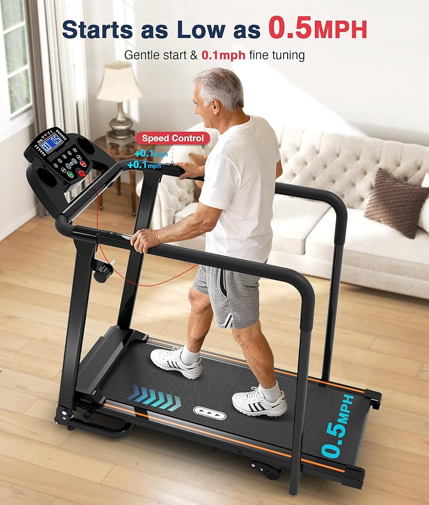 【قوية وعملية】- جهاز المشي Redliro لكبار السن يجمع بين القوة والدعم بسعة 300 رطل ونطاق سرعة 0.5-5 ميل في الساعة. يضمن إطارها الفولاذي القوي ثباتًا يصل إلى 300 رطل، في حين أن إعداد 0.5 ميل في الساعة مثالي لعمليات الإحماء أو المشي غير الرسمي. تناسب السرعة البالغة 5 ميلاً في الساعة كبار السن الذين يتقدمون من المشي إلى الركض الخفيف. بفضل جهاز المشي ذو المقابض، فإنه يوفر المزيد من الأمان والراحة، كما أن حامل الأكواب وحامل الهاتف المناسبين يجعله مثاليًا للتمرينات المنزلية لكبار السن.