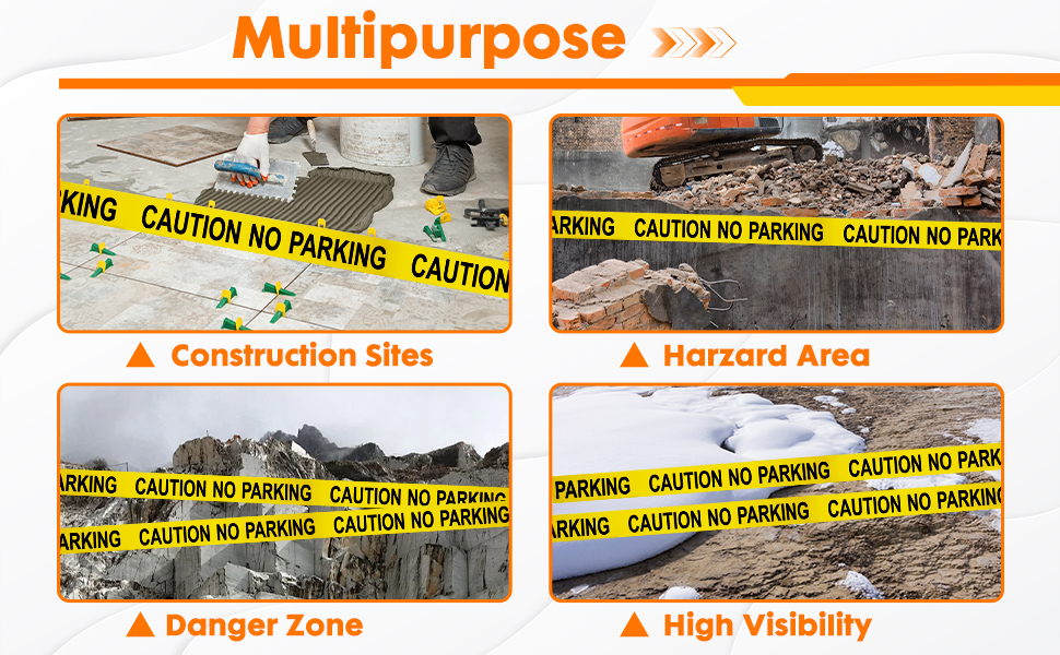 • ⚠️ أصفر ساطع لتحقيق أقصى قدر من الأمان - شريط تحذير أصفر واضح للغاية مع نص أسود غامق "CAUTION NO PARKING" يقدم تحذيرات واضحة لمناطق البناء أو المناطق الخطرة أو السيطرة على الحشود.
