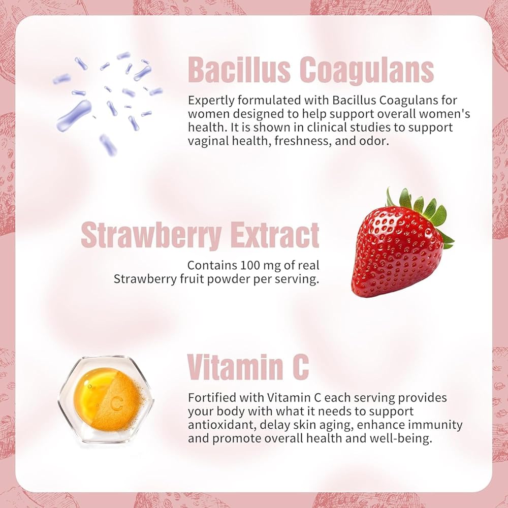 OPTIMIZE PH BALANCE - The ingredients in Probiotic helps crowd out harmful bacteria and promote pH balance for women. This convenient treat blends strawberry Fruit Powder and Bacillus Coagulans, offering a delicious way to support your pH balance and immune defense.