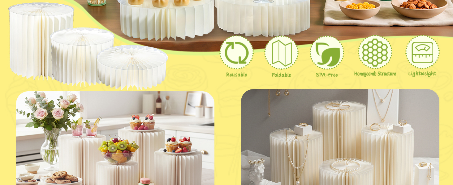 • 【هيكل قوي ومتين】مصنوع من الورق المقوى عالي الكثافة + ألواح PVC سميكة، مما يضمن قدرة تحمل قوية (يدعم الحلويات الثقيلة والمقتنيات والديكور).
