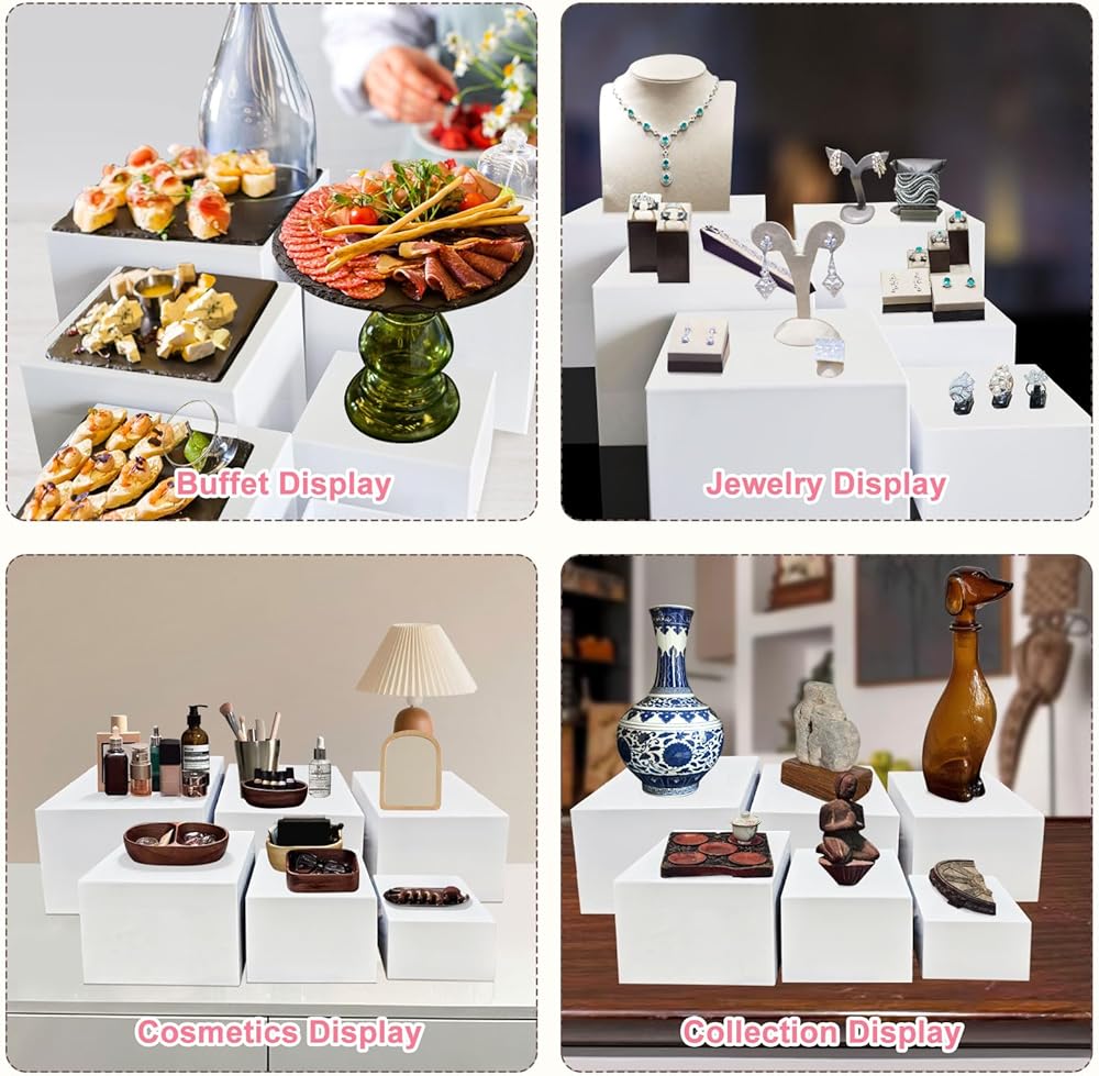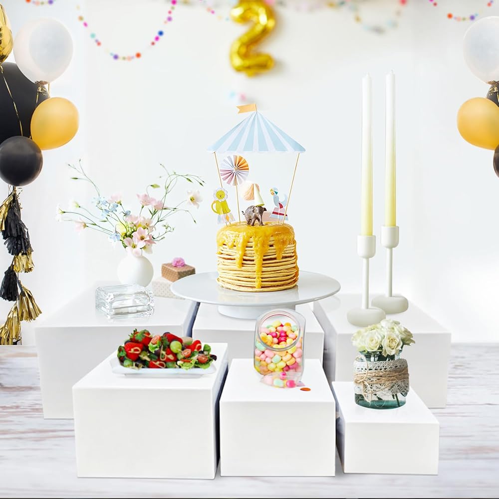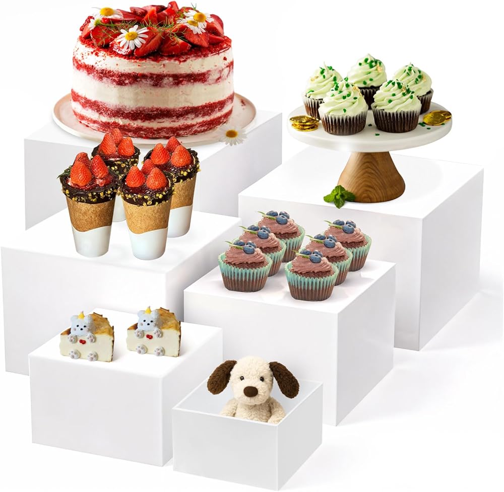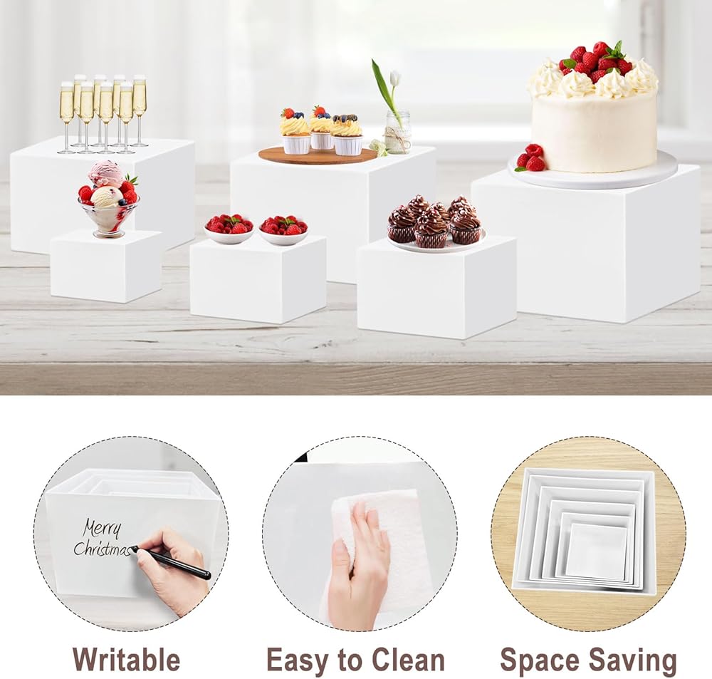 ستة أحجام متدرجة للتأثير البصري الديناميكي: تتضمن مجموعتنا ستة رافعات عرض ذات حجم دقيق (9.8 بوصة × 9.8 بوصة × 6.9 بوصة | 8.9 بوصة × 8.9 بوصة × 6.4 بوصة | 7.9 بوصة × 7.9 بوصة × 5.9 بوصة | 6.9 بوصة × 6.9 بوصة × 4.9 بوصة | 5.9 بوصة × 5.9 بوصة × 3.9 بوصة | 4.9 بوصة × 4.9 بوصة × 2.9 بوصة) لإنشاء العمق والبعد. اعرض كل شيء بدءًا من الكعك الكبير والأطباق إلى الكعك الصغير والمجوهرات الرقيقة، وتضمن الرافعات البيضاء حصول كل قطعة على الاهتمام الذي تستحقه.