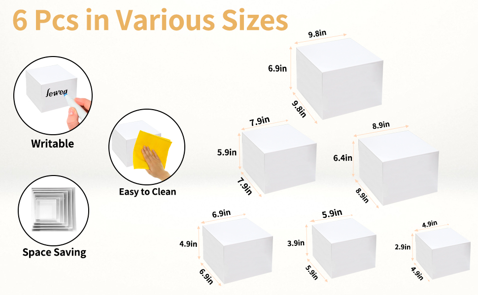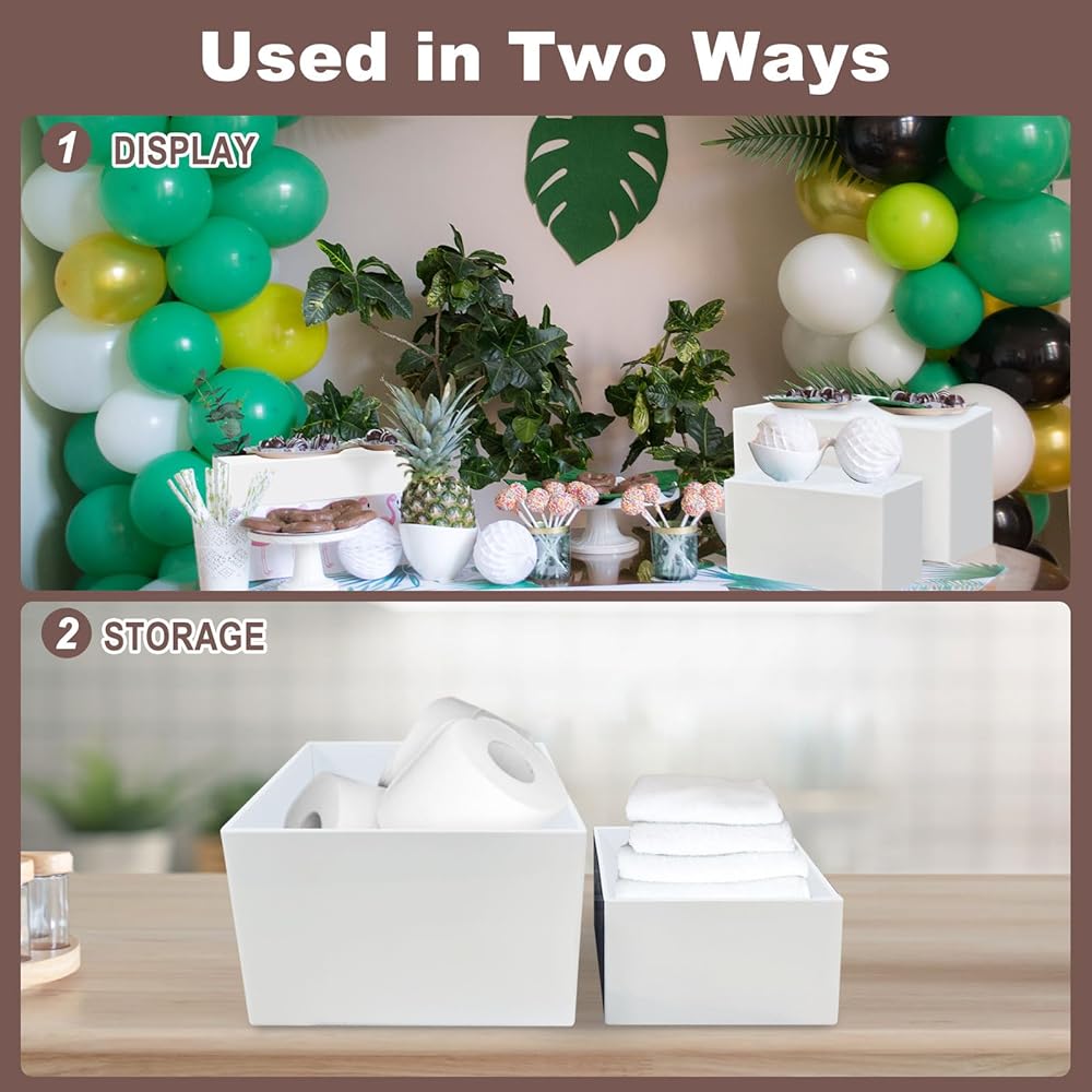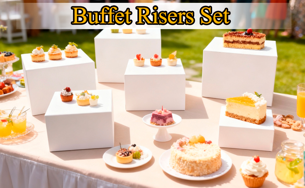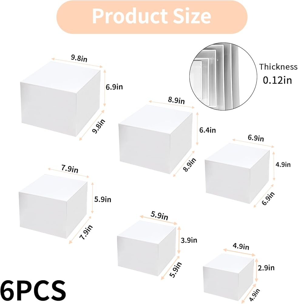 ستة أحجام متدرجة للتأثير البصري الديناميكي: تتضمن مجموعتنا ستة رافعات عرض ذات حجم دقيق (9.8 بوصة × 9.8 بوصة × 6.9 بوصة | 8.9 بوصة × 8.9 بوصة × 6.4 بوصة | 7.9 بوصة × 7.9 بوصة × 5.9 بوصة | 6.9 بوصة × 6.9 بوصة × 4.9 بوصة | 5.9 بوصة × 5.9 بوصة × 3.9 بوصة | 4.9 بوصة × 4.9 بوصة × 2.9 بوصة) لإنشاء العمق والبعد. اعرض كل شيء بدءًا من الكعك الكبير والأطباق إلى الكعك الصغير والمجوهرات الرقيقة، وتضمن الرافعات البيضاء حصول كل قطعة على الاهتمام الذي تستحقه.