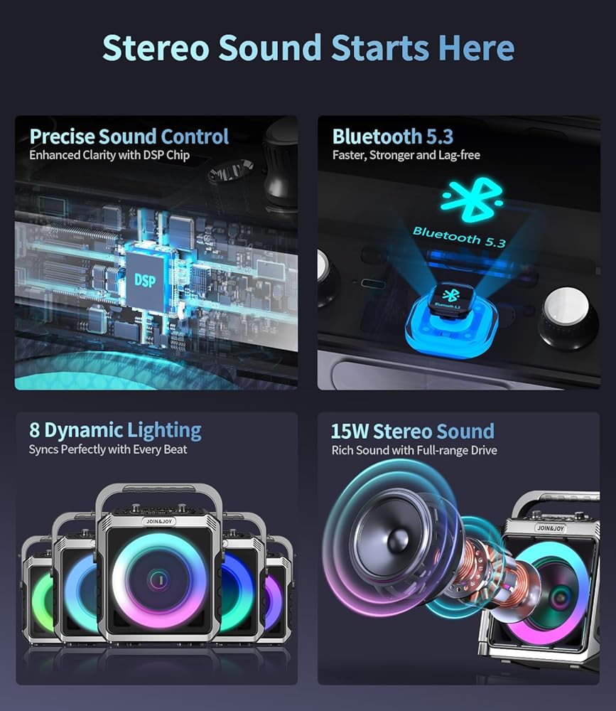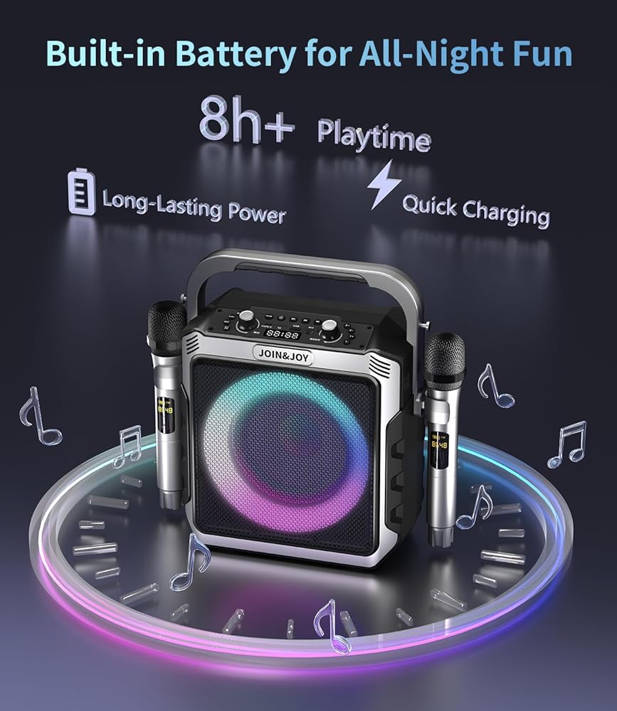 • DAZZLING LED LIGHTS FOR PARTY VIBES – Built-in 8 Dynamic RGB Lighting Modes sync to the rhythm of the music, creating a lively party atmosphere; easily switch modes or turn them off for a classic look during family karaoke or quiet gatherings.