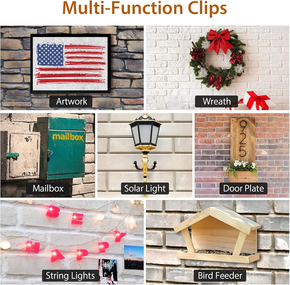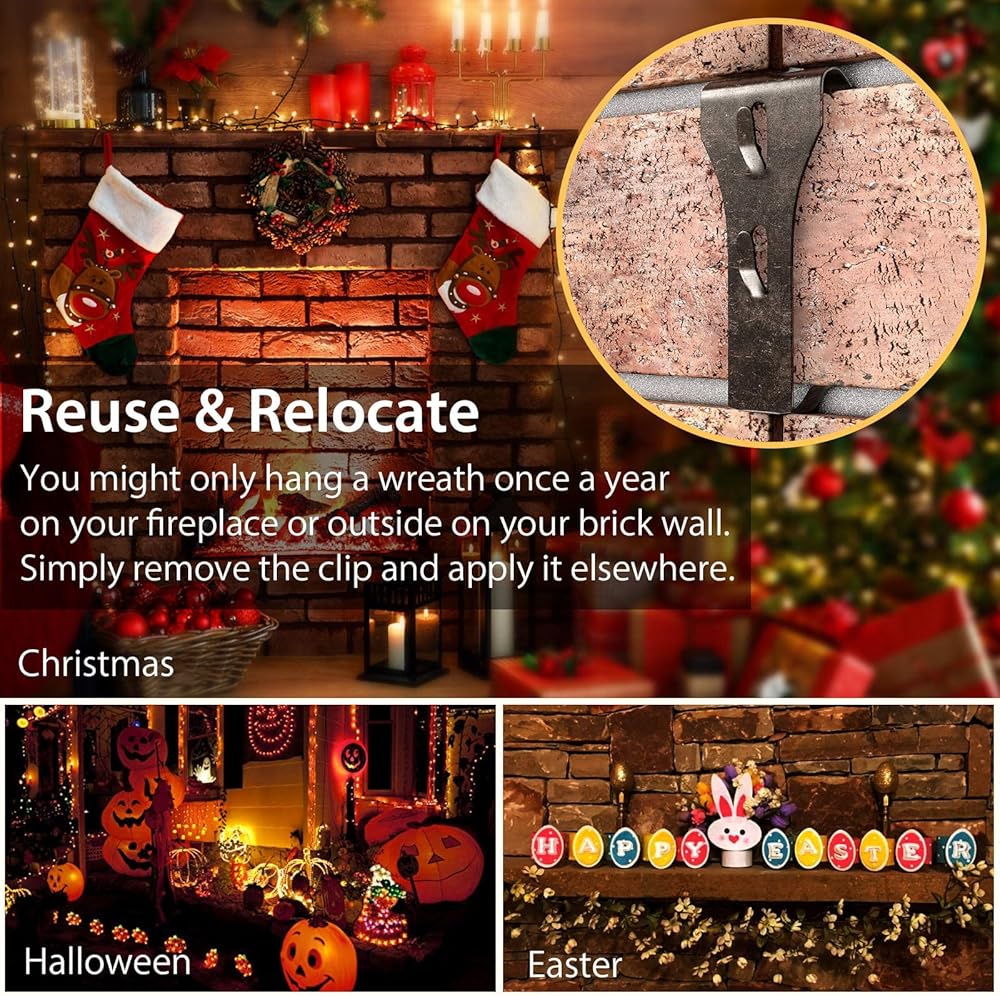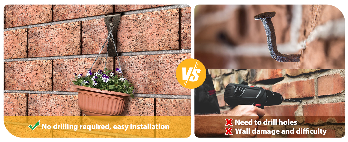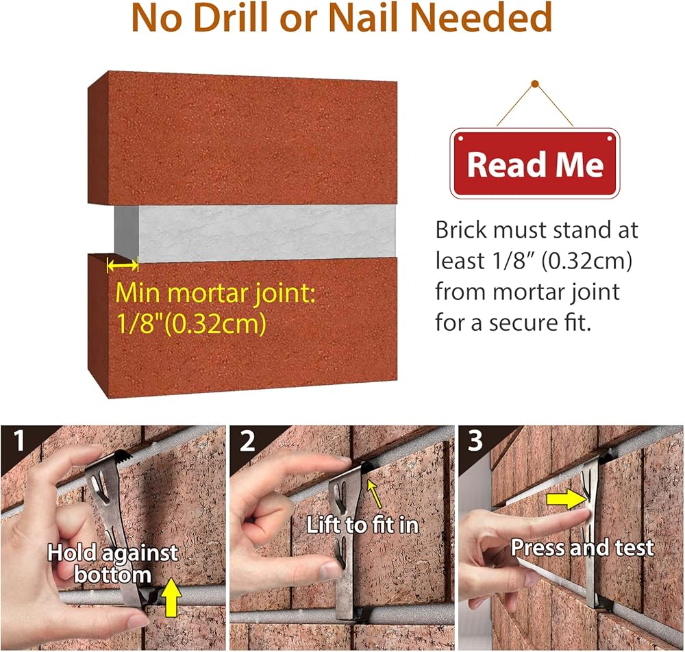 • [بدون فتحة] مشبك خطافات للطوب - شماعات الطوب سهلة التركيب ونقلها مما لن يؤدي إلى ثقب أي خطاف على جدار الطوب الخاص بك. لا توجد أداة مطلوبة للتثبيت. لن يحدث أي ضرر لجدار الطوب الخاص بك عند إزالة مشابك جدار الطوب