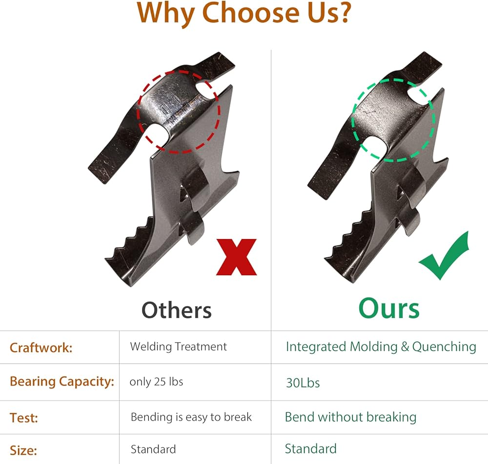 • [شديد التحمل] خطافات من الطوب للتعليق - اعتماد عملية تبريد فريدة من نوعها عززت أداء خطافات الطوب وبالتالي يمكن لمشبك حائط واحد من الطوب أن يتحمل ما يصل إلى 30 رطلاً. سيتطلب تعليق العناصر الثقيلة المزيد من الخطافات المصنوعة من الطوب لدعم الوزن