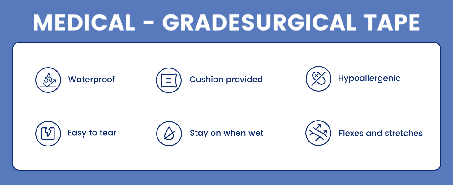 حماية ضد الماء للاستخدام طويل الأمد: يضمن بقاء الضمادات أو الضمادات الخاصة بك آمنة حتى في الظروف الرطبة. مثالي للاستخدام أثناء الاستحمام أو السباحة أو أثناء الأنشطة البدنية.