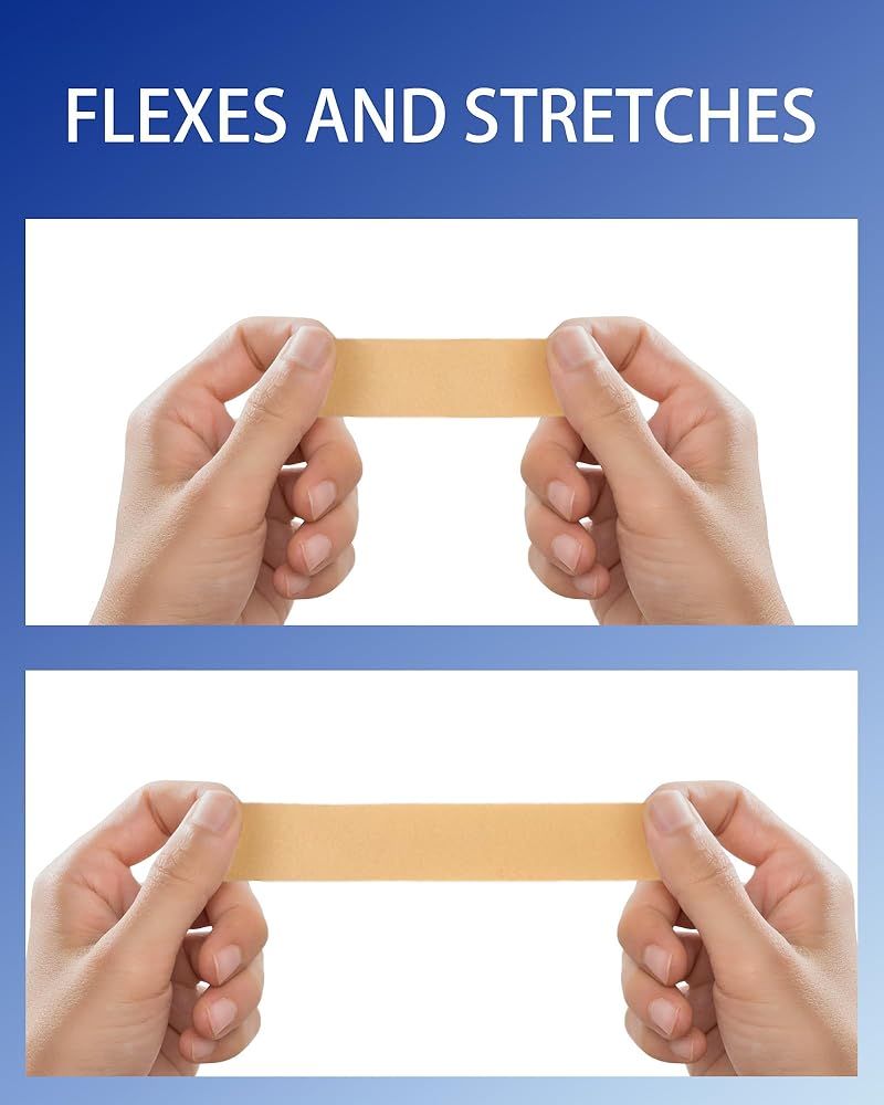 مرن ومتين: يتمدد ويتوافق بسهولة مع انحناءات الجسم، مما يوفر ملاءمة مريحة على المفاصل أو المرفقين أو الركبتين أو المناطق الصعبة مع ضمان التصاق قوي للارتداء طويل الأمد.