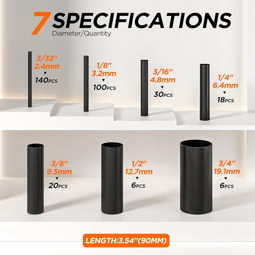 [أحجام متنوعة لإصلاحات أسرع] هل سئمت من إضاعة الوقت في البحث عن أنابيب الانكماش الحراري ذات الحجم المناسب؟ تحتوي هذه المجموعة على 320 قطعة مقطوعة مسبقًا (3.54 بوصة لكل منها) في 7 أقطار شائعة: 3/32 بوصة (140 قطعة)، 1/8 بوصة (100 قطعة)، 3/16 بوصة (30 قطعة)، 1/4 بوصة (18 قطعة)، 3/8 بوصة (20 قطعة)، 1/2 بوصة (6 قطع)، 3/4 بوصة (6 قطع)، حتى تتمكن من الحصول على القطعة المناسبة بسرعة وإنجاز المهمة.