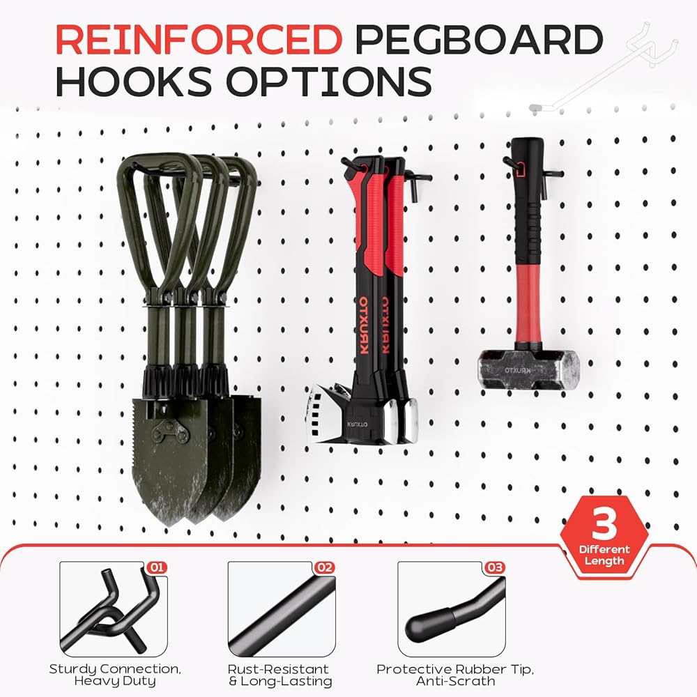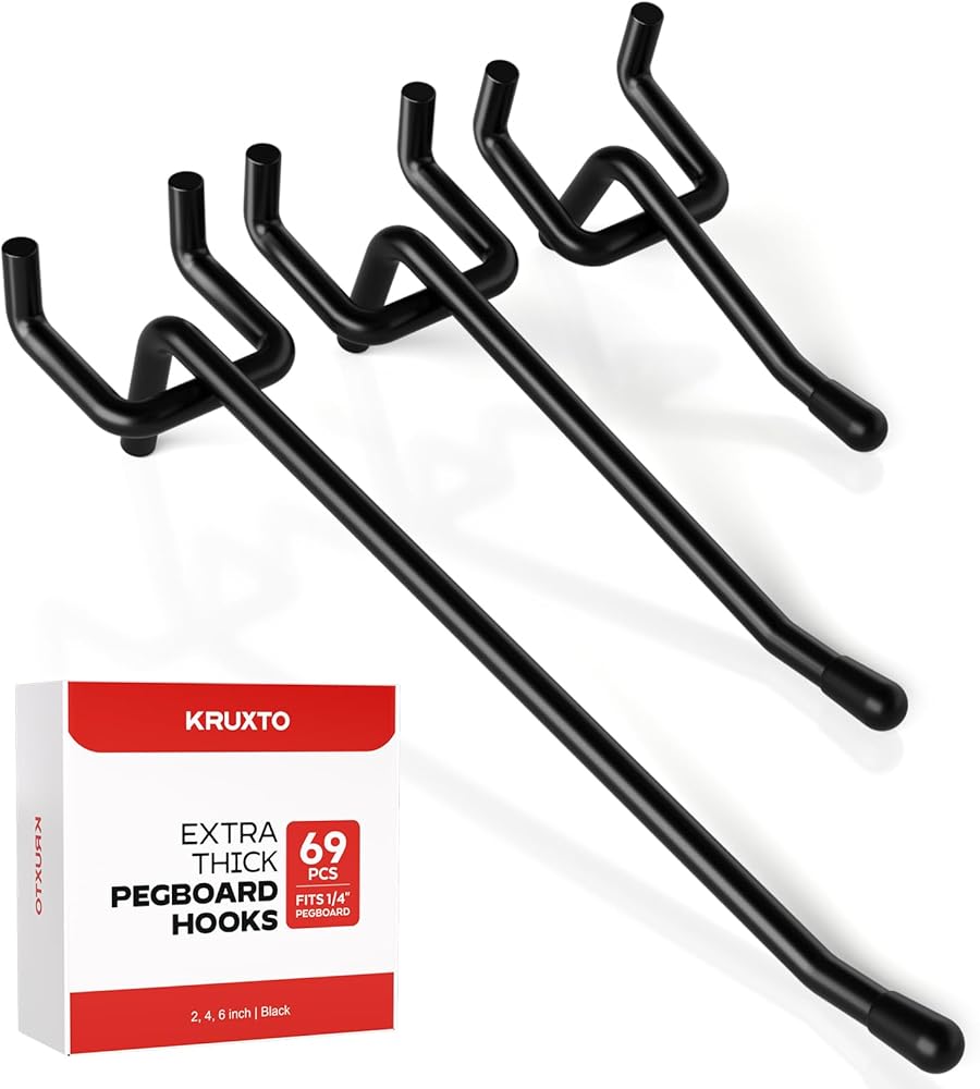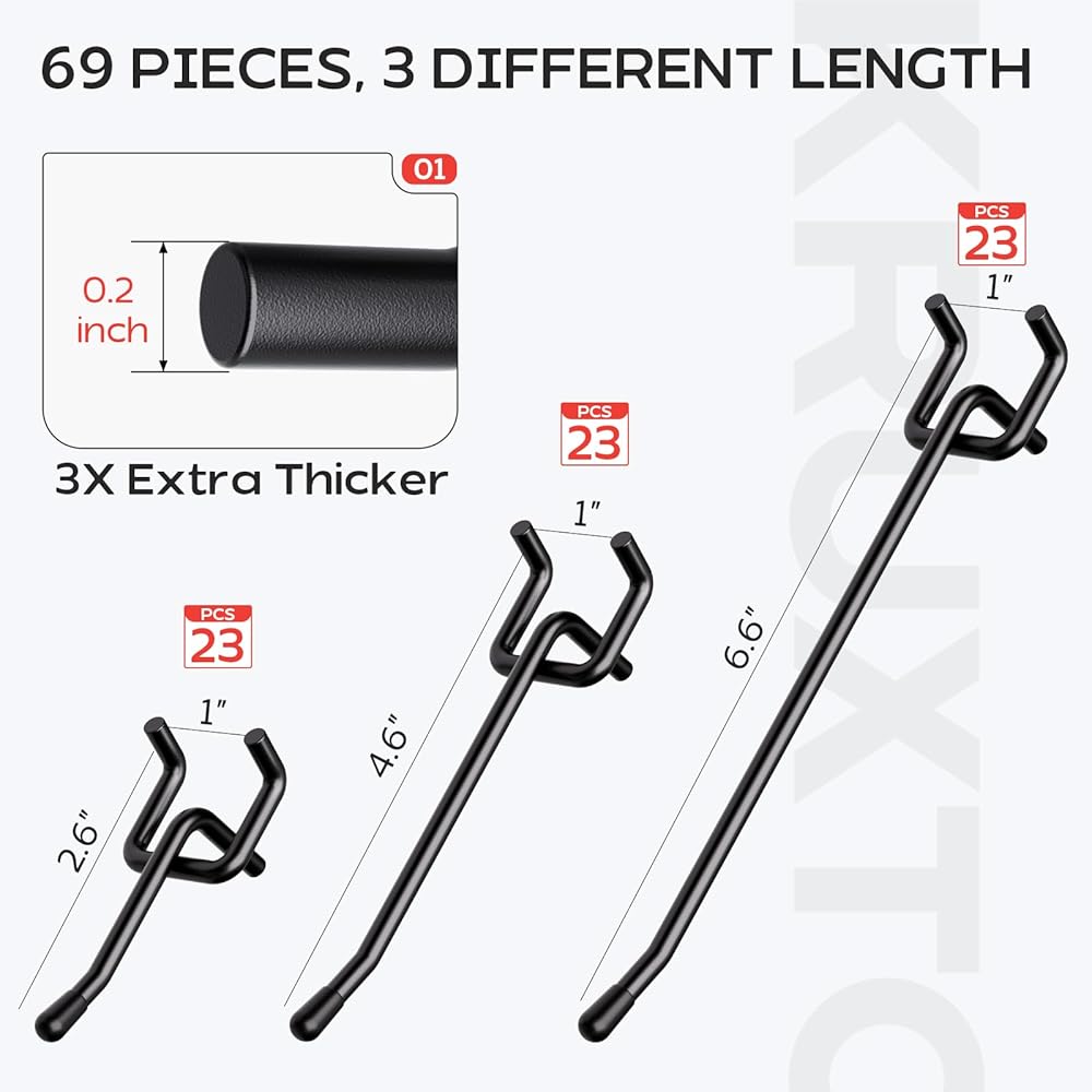 All-In-One Pegboard Hooks Kit: KRUXTO peg board organizer accessories contains 69 pack pegboard accessories, 3 different length peg board hooks including 23pcs x 2 inch pegboard hooks, 23pcs x 4 inch hooks, 23pcs x 6 inch peg board hooks. This L-shaped design is sturdy, makes your peg hooks more stable when hanging the tools or items. Also comes with rubber tips for protection.
