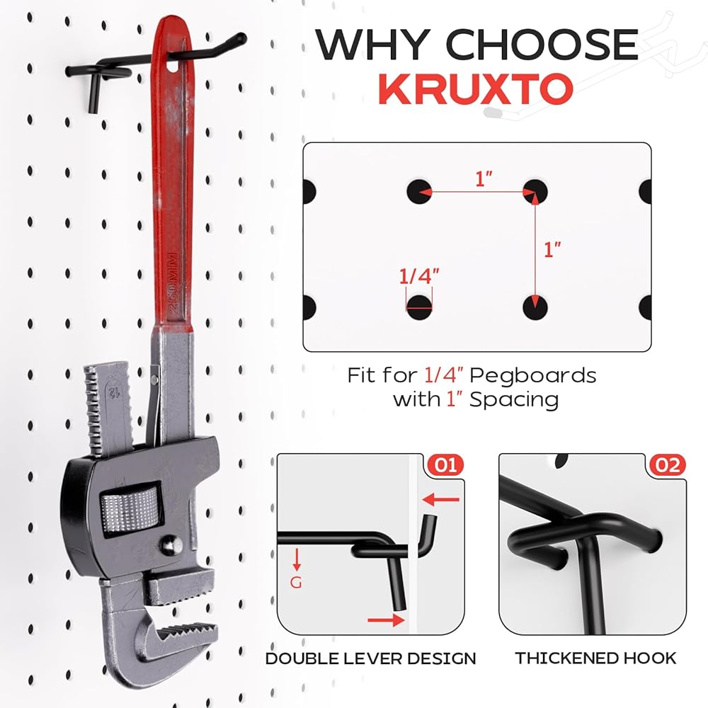 Essential Peg Board Hooks for Hanging: KRUXTO 3 different size pegs for pegboard are better to meet your various display items for wall hanging and shelving. Moreover, the pegboard accessories are ideal for garage, workbench, kitchen, basement, craft workshop, game organization, store or warehouse.