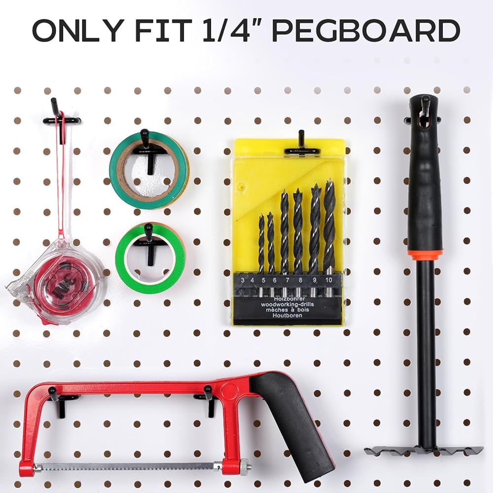 Universal Compatibllity: With a 0.2 inch thick shaft, these peg board tool hangers fit perfectly into standard 1/4" pegboards with 1" spacing. Compatible with both metal and non-metal boards, they stay firmly in place, even under heavy loads.