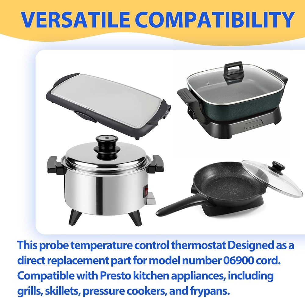 توافق متعدد الاستخدامات: تم تصميم منظم الحرارة للتحكم في درجة الحرارة هذا كقطعة بديلة مباشرة لسلك رقم الموديل 06900 وهو متوافق مع أجهزة مطبخ بريستو، بما في ذلك الشوايات والمقالي وأدوات طبخ الضغط والمقالي. ارجع إلى الصورة المقدمة للحصول على قائمة واسعة من النماذج المتوافقة