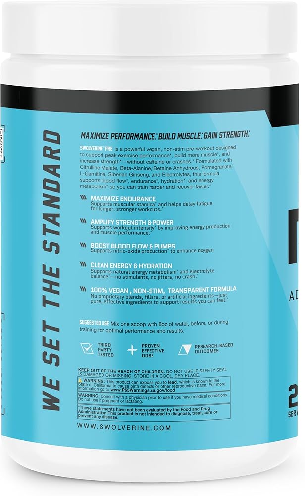 Power Your Workout. Maximize Endurance. No Stimulants. Swolverine's Non-Stim Pre-Workout is a stimulant-free formula designed to enhance endurance, increase strength, improve blood flow, and support energy metabolism—without caffeine or jitters. Packed with performance-driven ingredients like Citrulline Malate, Beta-Alanine, Betaine, Pomegranate, L-Carnitine, Siberian Ginseng, and Electrolytes, this advanced pre-workout fuels your training without the crash or overstimulation of traditional pre-workouts. Perfect for late-night lifters, caffeine-sensitive athletes, or those who want to cycle off stimulants, Swolverine's fully transparent, clean formula ensures you get the pump, endurance, focus, and energy you need—without unnecessary fillers or artificial additives.