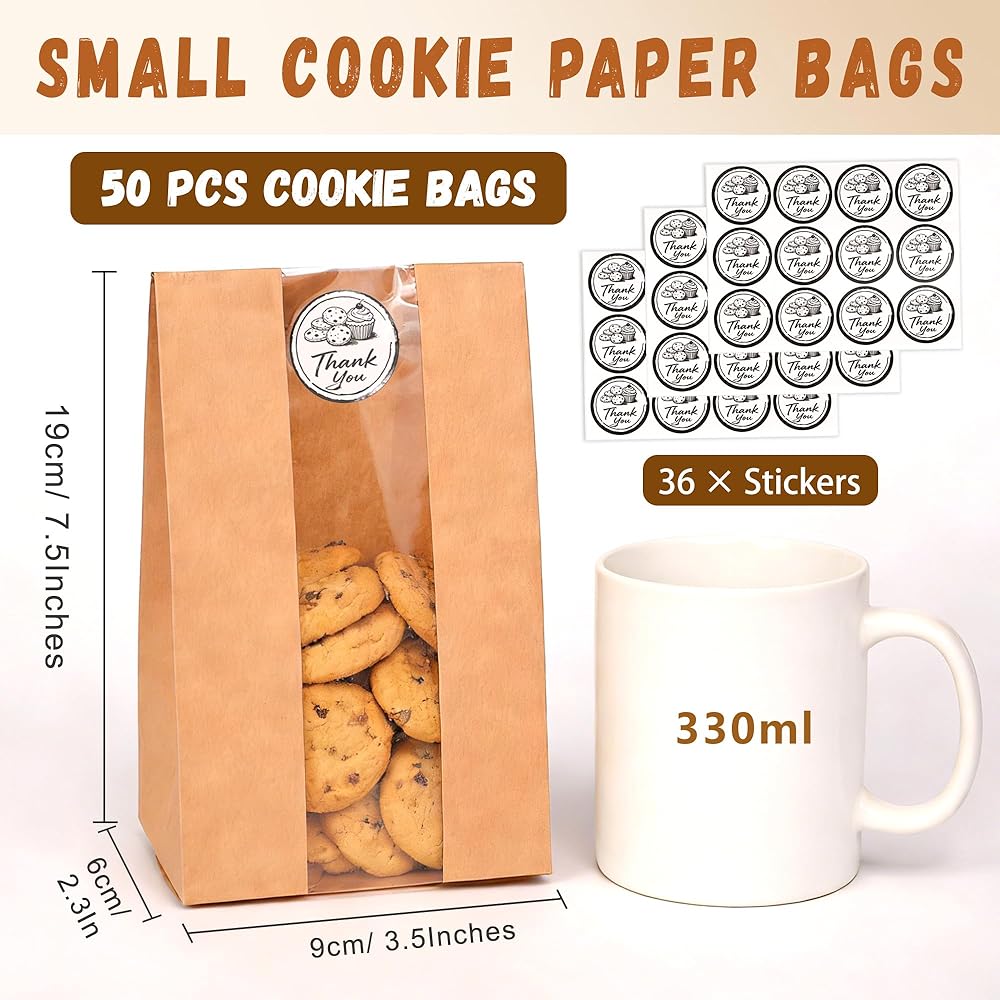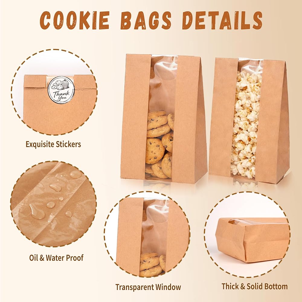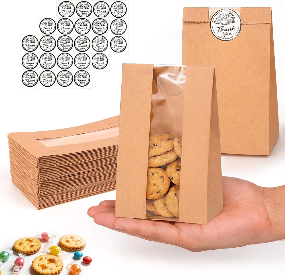 50 عبوة من أكياس البسكويت مع نافذة، مقاس 8.89 سم × 6.35 سم × 19.05 سم، أكياس مخبز ورقية كرافت مع ملصقات للوجبات الخفيفة والكب كيك والفشار وحبوب القهوة وهدايا الحفلات وتغليف البسكويت