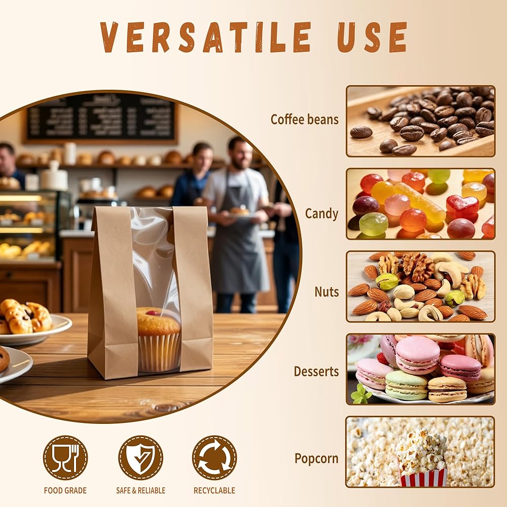 Material: High-quality, food-safe kraft paper with laminated PE inner liner and scratch-resistant clear plastic window