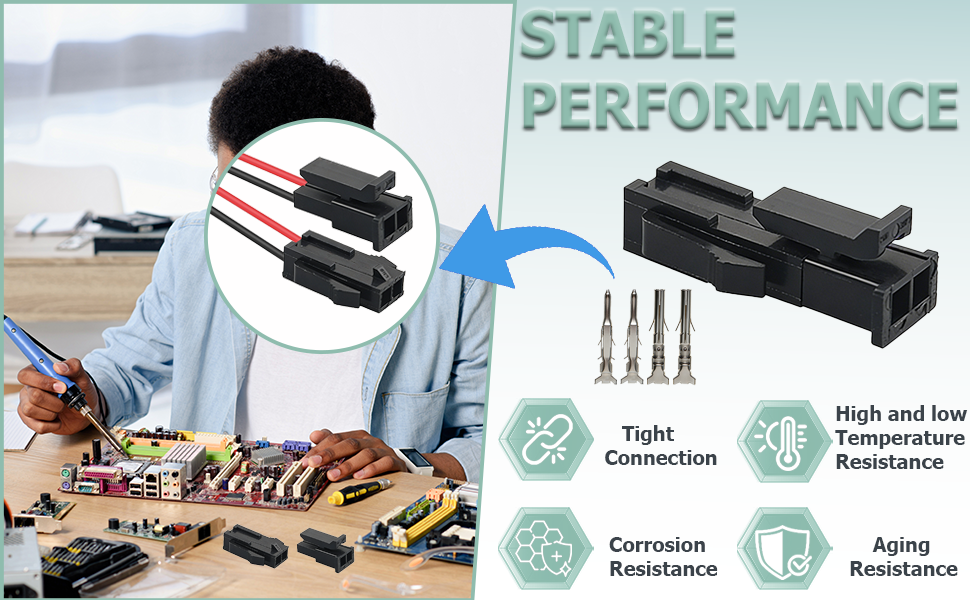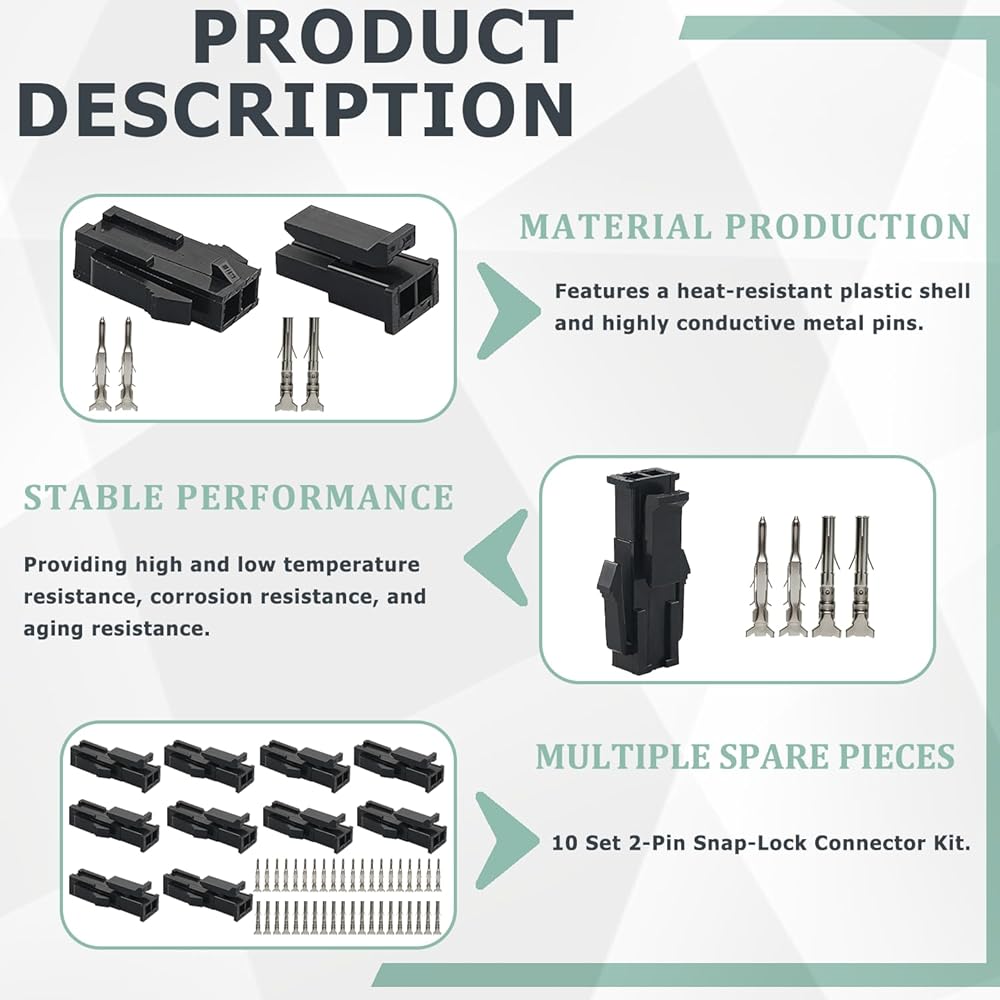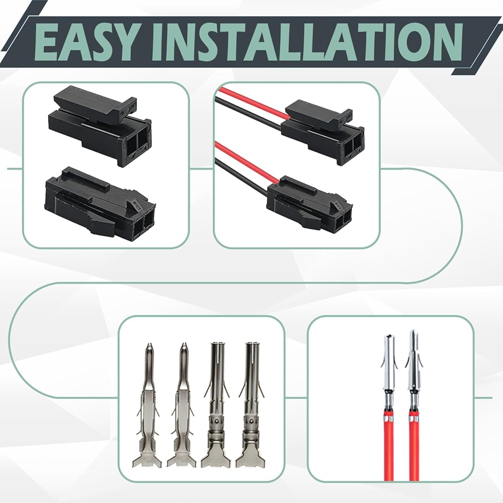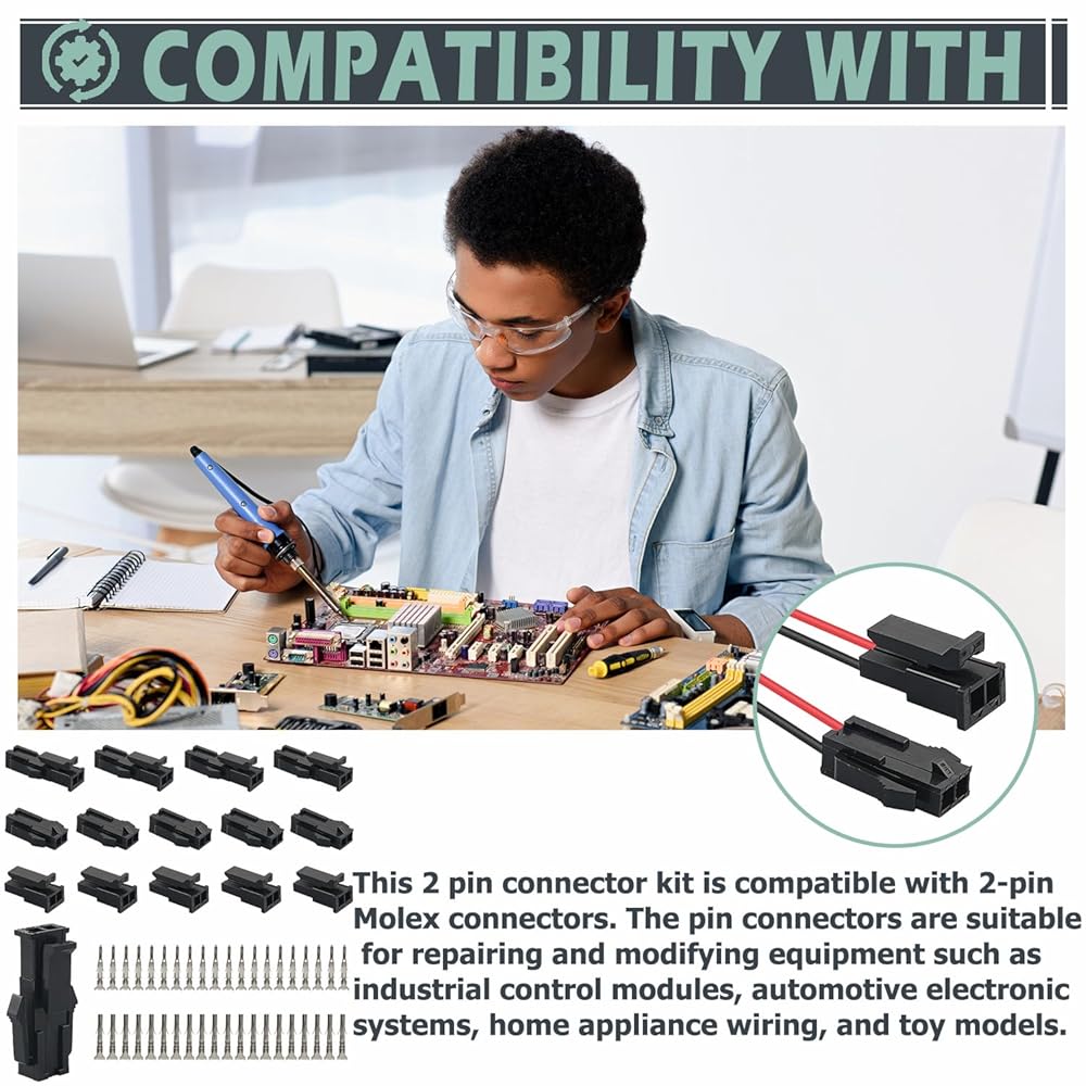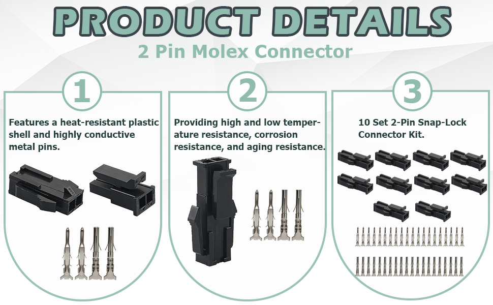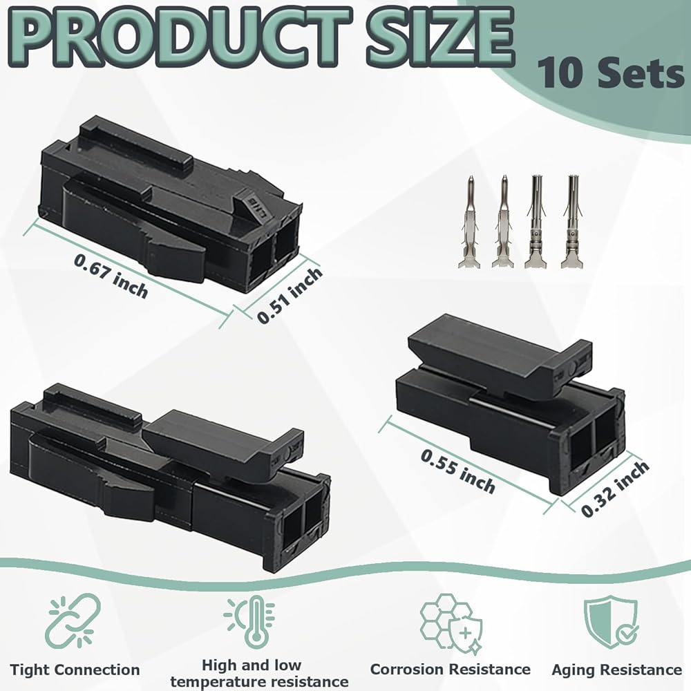 [توافق واسع]: مجموعة الموصلات ذات 2 دبوس متوافقة مع موصلات موليكس ذات 2 دبوس. تعتبر الموصلات الدبوسية مناسبة لإصلاح وتعديل المعدات مثل وحدات التحكم الصناعية والأنظمة الإلكترونية للسيارات وأسلاك الأجهزة المنزلية ونماذج الألعاب. يساعد الإدخال والإزالة بسلاسة والاتصال الوثيق على تجنب فشل الاتصال الناتج عن عدم توافق الواجهة