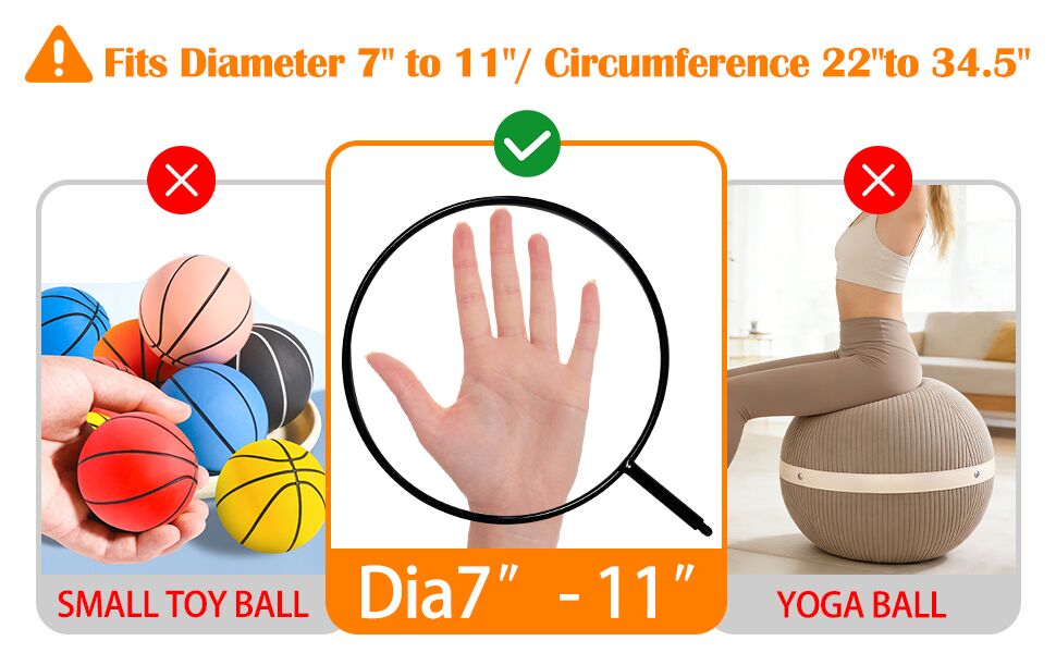 تحذير مهم بخصوص الاستخدام والتوافق: تم تصميم هذا الحامل لتخزين وتنظيم الكرات الرياضية ذات الحجم القياسي بشكل آمن. تناسب بشكل مثالي الكرات التي يبلغ قطرها حوالي 7-11 بوصة، ومحيطها من 22 إلى 34.5 بوصة، بما في ذلك كرات القدم، وكرات السلة، والكرات الطائرة، وكرات القدم. يرجى ملاحظة أنها غير مخصصة لكرات اليوغا/التمرين الكبيرة، أو كرات الألعاب الصغيرة، أو الكرات البلاستيكية خفيفة الوزن.