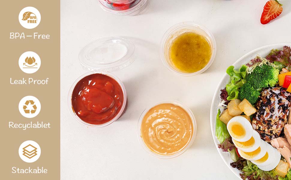 • 🔒 【موثوقية مقاومة للتسرب 】 ختم محكم للغاية: على عكس البدائل الواهية، تتميز أكوابنا بسعة 118 مل بغطاء مناسب بدقة يتم تثبيته بشكل آمن لمنع الانسكابات والتسربات الفوضوية. مثالية لنقل صلصة الغمس أو صلصة السلطة أو التوابل السائلة دون قلق