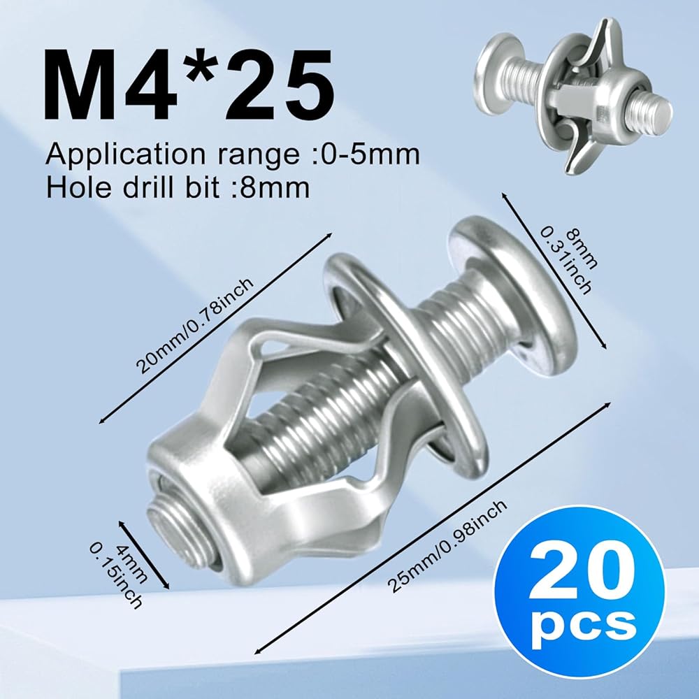 Package includes:20pcs metal hollow wall anchors,The reserved hole diameter of M4 model is 8-10MM (0.3 "-0.46"),It can be used for doors, windows, iron pipes, bathroom accessories, etc..