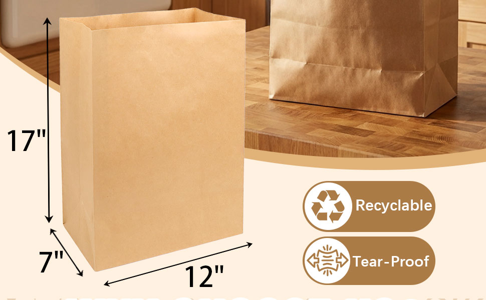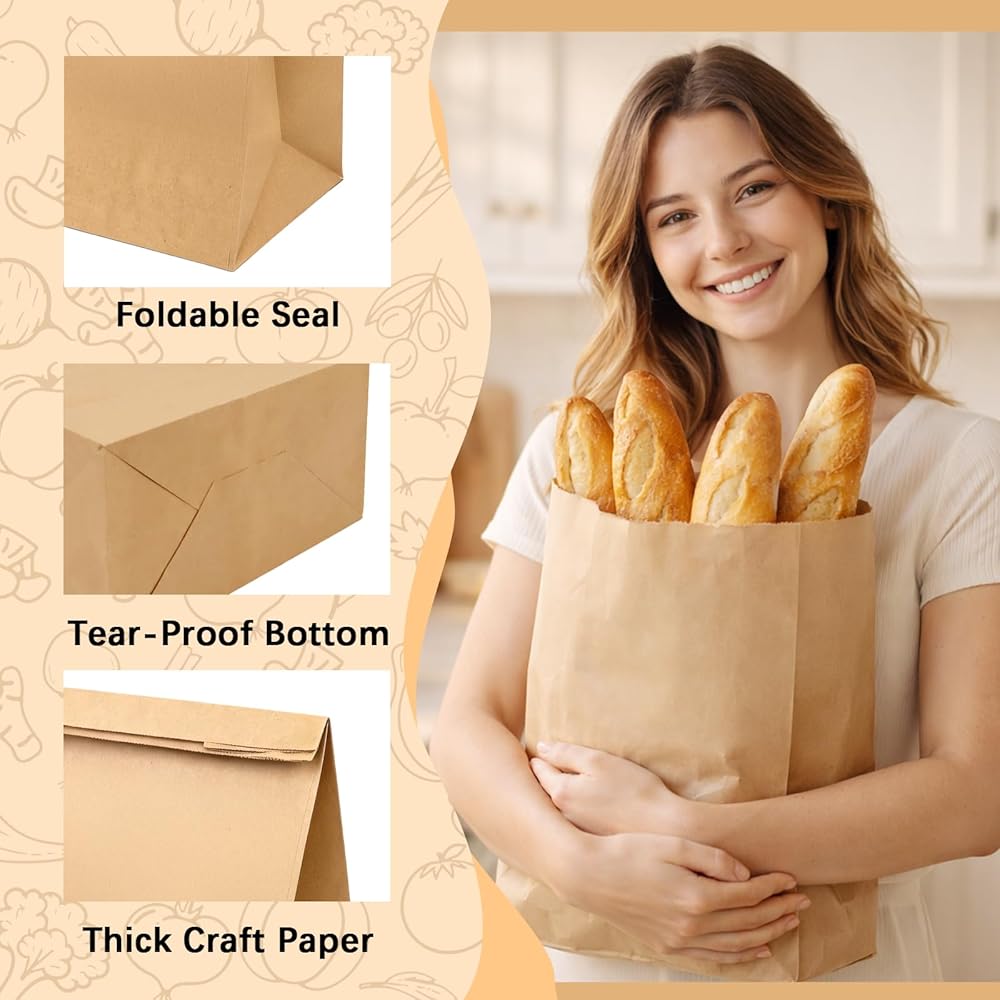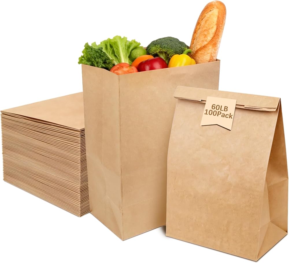 • أكياس ورقية شديدة التحمل: حقائب البقالة مصنوعة من ورق كرافت سميك ممتاز، وهو مصمم ليكون قويًا ويدوم طويلاً. تتميز أكياس ورق كرافت بقاعدة معززة ومقاومة استثنائية للتمزق، وتدعم ما يصل إلى 60 رطلاً