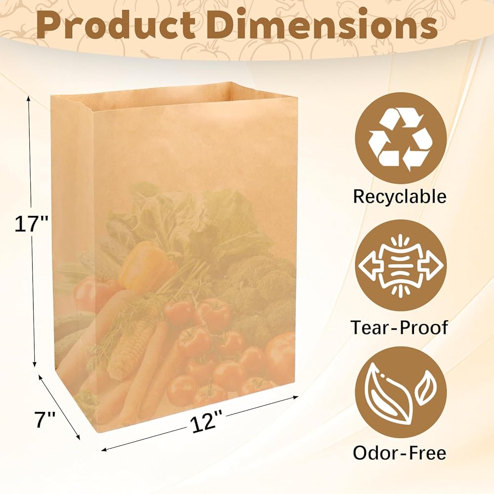 • حزمة قيمة رائعة: تحتوي كل عبوة على 100 كيس بقالة ورقي مقاس 12 × 7 × 17 بوصة، مما يوفر قيمة رائعة للاستخدام الشخصي والتجاري. قم بتخزين وحفظ هذه الحقيبة الورقية متعددة الاستخدامات عالية السعة