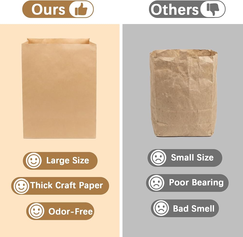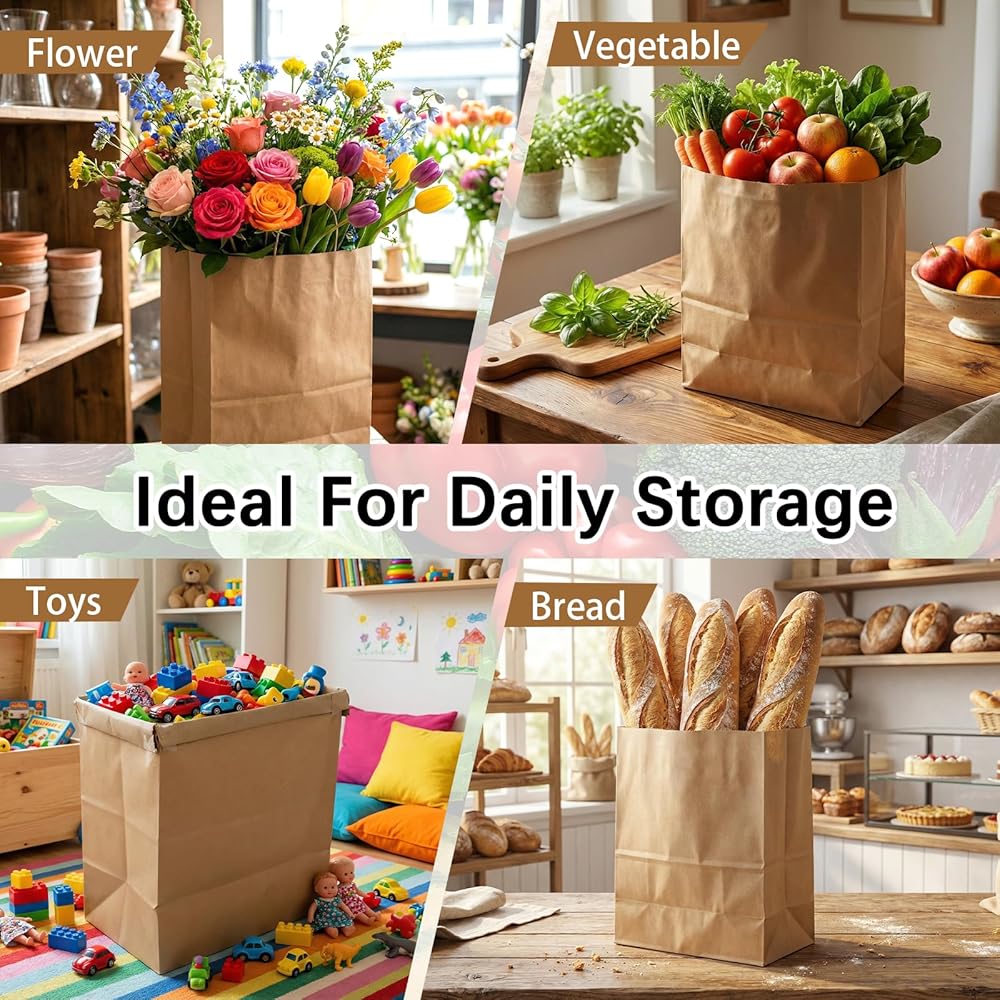 • مريحة للحياة اليومية: تم تصميم أكياس البقالة الورقية للتعامل مع البقالة اليومية ومثالية لتخزين الطعام وحمله. بالإضافة إلى ذلك، فإن الأكياس الورقية الكبيرة مناسبة أيضًا للتسوق أو تناول الطعام في الخارج أو نفايات المطبخ أو كبطانات لسلال المهملات