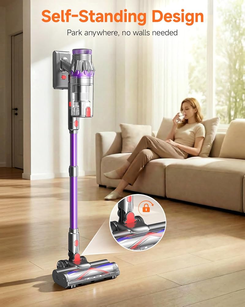 [تصميم قائم بذاته وشاشة لمس LED] تتميز هذه المكنسة الكهربائية اللاسلكية للمنزل بوظيفة قائمة بذاتها، ويمكن أن تقف بمفردها في أي مكان دون البحث عن نقطة دعم. كما أن المكنسة الكهربائية اللاسلكية مزودة بشاشة LED تعمل باللمس تتيح لك ضبط الشفط بلمسة بسيطة والتحقق من البطارية المتبقية ومستوى امتلاء سلة المهملات والتذكير بالتشابك في أي وقت.