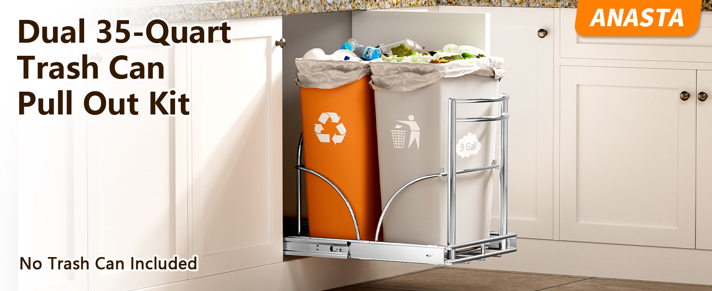 【سلال قمامة قابلة للسحب جنبًا إلى جنب】يمكن لمسار سلة المهملات في المطبخ أن يحمل علب قمامة مزدوجة بسعة 9 جالون أو صناديق قمامة مزدوجة بسعة 35 كيو تي. واحدة لصندوق النفايات، والأخرى لصندوق إعادة التدوير.