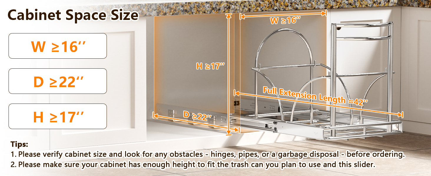 【الحد الأدنى لأبعاد الخزانة المطلوبة: 22 بوصة عمق × 16 بوصة عرض × 17 بوصة ارتفاع】 𝗱𝗶𝗺𝗲𝗻𝘀𝗶𝗼𝗻𝘀, 𝗳𝗲𝗲𝗹 𝗳𝗿𝗲𝗲 𝘁𝗼 𝗿𝗲𝗮𝗰𝗵 𝗼𝘂𝘁! أبعاد المنتج لرف سلة المهملات المنزلق للخارج: 19.88 بوصة عمق × 15.16 بوصة عرض × 16.14 بوصة ارتفاع، الطول المقصود بالكامل هو 91.44 سم، مجموعة سلة المهملات القابلة للسحب تحت الحوض لتناسب معظم خزائن العائلات الأمريكية (يرجى قياس خزانة الحوض قبل الشراء.