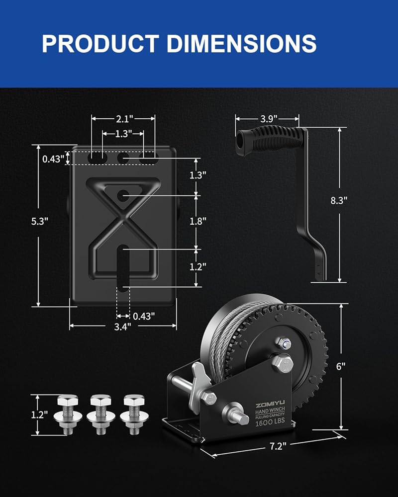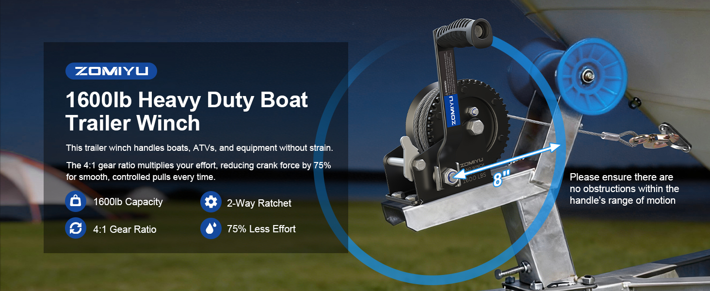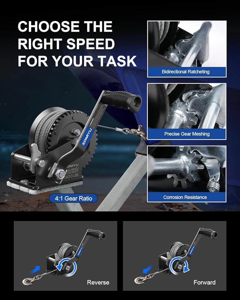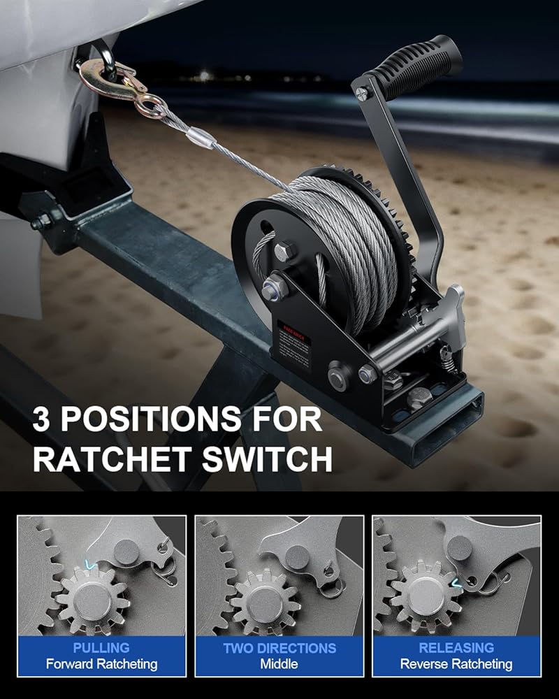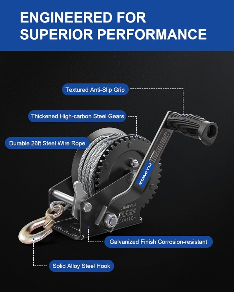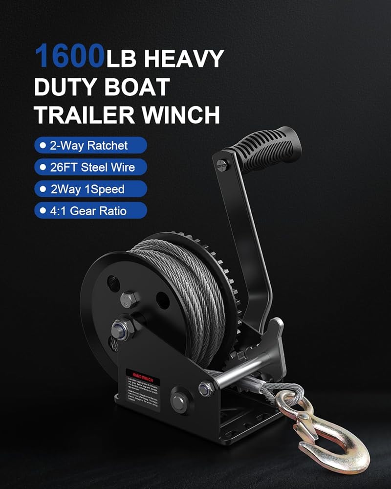 مصممة للأحمال المطلوبة: توفر رافعة الكرنك اليدوية هذه قدرة سحب تصل إلى 1600 رطل / 725 كجم مع نسبة تروس 4:1، طول الكابل الفولاذي: 8 متر (26 قدم) ø5.0 مم، مما يقلل الجهد بنسبة 75% لرفع وسحب وتحميل القوارب أو المقطورات أو مركبات الدفع الرباعي بشكل سلس وفعال.