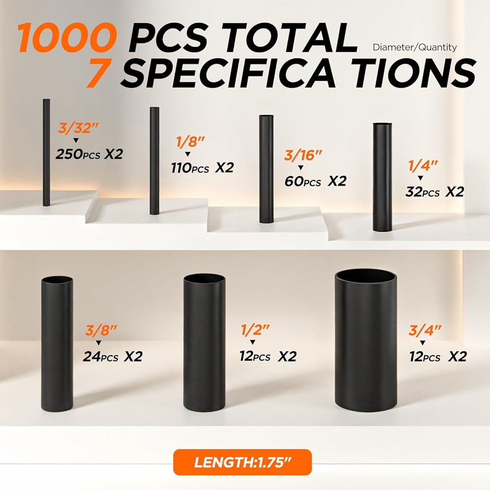 [1000 قطعة في عبوتين و7 أحجام الأكثر استخدامًا] تأتي مع 1000 قطعة مقطوعة مسبقًا (1.75 بوصة لكل منها) في 7 أقطار شائعة: 3/32 بوصة (250 قطعة *2)، 1/8 بوصة (110 قطعة *2)، 3/16 بوصة (60 قطعة *2)، 1/4 بوصة (32 قطعة *2)، 3/8 بوصة (24 قطعة *2)، 1/2 بوصة (12 قطعة *2)، 3/4 بوصة (12 قطعة *2). مجموعة كاملة وجاهزة للاستخدام لجميع احتياجات الأسلاك والإصلاح.
