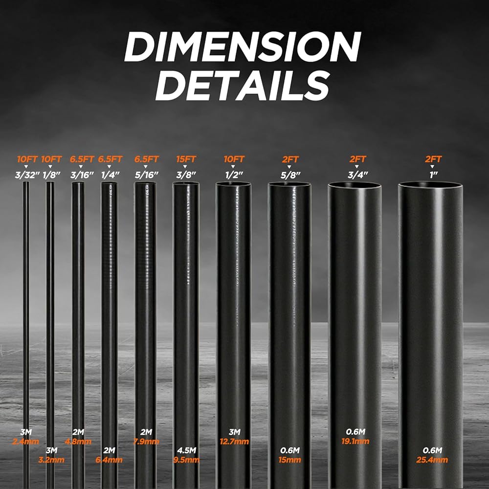 [10 مقاسات الأكثر استخدامًا] يأتي مع 10 مقاسات في 10 أقطار شائعة: 3/32 بوصة (10FT)، 1/8 بوصة (10FT)، 3/16 بوصة (6.5FT)، 1/4 بوصة (6.5FT)، 5/16 بوصة (6.5FT)، 3/8 بوصة (15FT)، 1/2 بوصة (10FT)، 5/8 بوصة (2FT)، 3/4 بوصة (2 قدم)، 1 بوصة (2 قدم). لجميع احتياجات الأسلاك والإصلاح. يبلغ طوله الإجمالي 70.5 قدمًا.