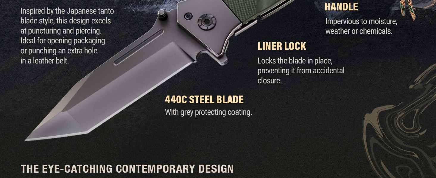 تحتوي سكين الجيب للرجال على شفرة حادة تانتو مصنوعة من الفولاذ المقاوم للصدأ القوي والمتين 440 ومغطاة بمادة TI-NI. شفرة متينة تصل درجة حرارتها إلى 60 HRC، مما يضمن أداء قطع استثنائيًا. مادة المقبض مصنوعة من المعدن والبلاستيك. نوع القفل - قفل بطانة. الطول الإجمالي - 8.66 بوصة، طول الشفرة - 3.54 بوصة؛ طول المقبض - 5.12 بوصة. الوزن - 7.76 أونصة.