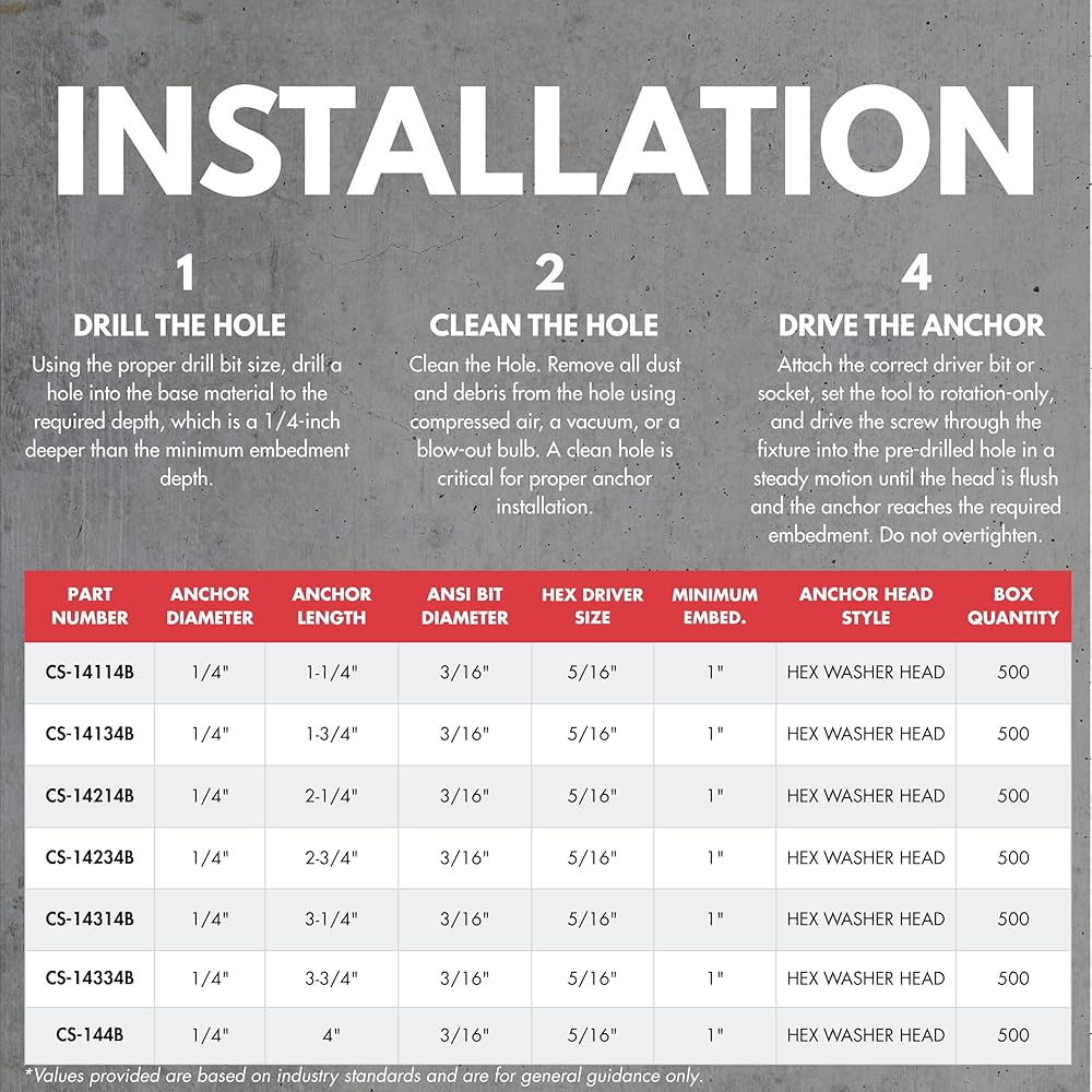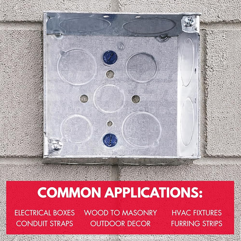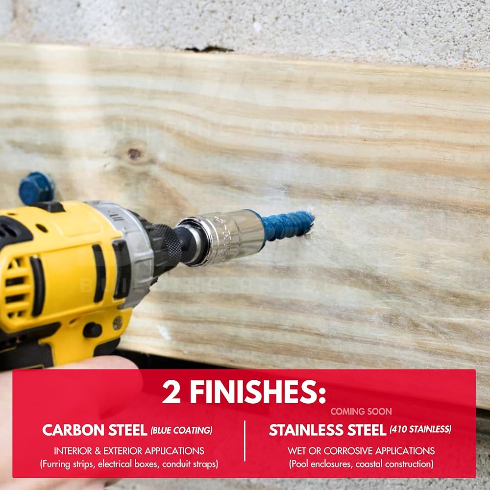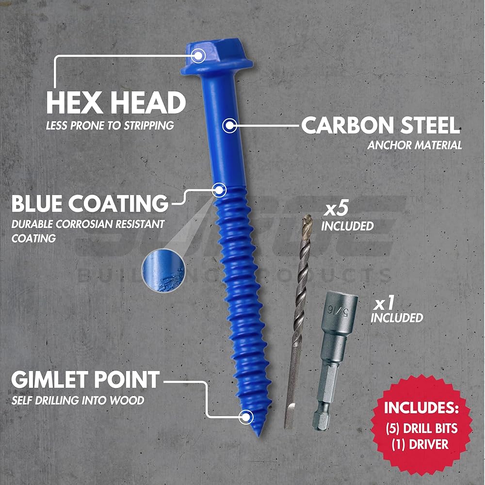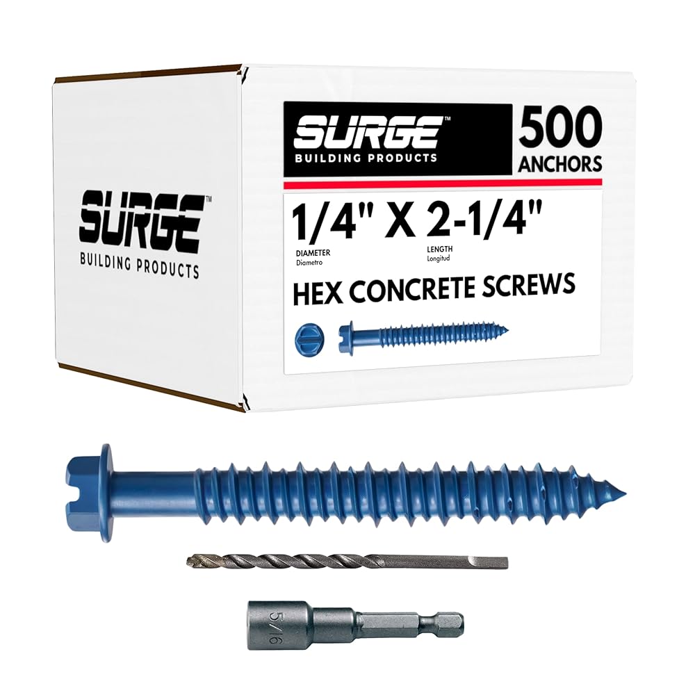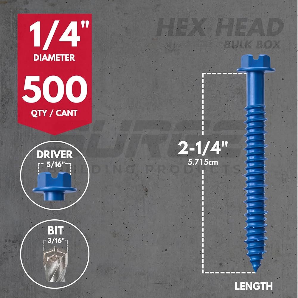 Tackle tough projects with confidence using Surge Building Products 1/4" blue hex self tapping concrete screws, designed for secure fastening in concrete, brick, block, stucco, and even wood. Whether you're working on exterior walls, furring strips, or electrical boxes, these versatile cement screws for concrete deliver high-strength performance for light to medium duty jobs. Each case of concrete anchors and screws kit includes a precision-matched drill bit for cleaner pilot holes and faster installation. The screws feature a gimlet point for self-drilling into wood, while high-low threads actively remove debris for a solid hold in masonry and brick applications. Whether you need masonry screws for brick or brick anchors for outdoor projects, this all-in-one solution delivers both efficiency and durability. Manufactured from carbon steel and finished with a corrosion-resistant blue coating, these concrete anchor screws are engineered to withstand harsh environments—making them ideal for interior and exterior projects alike. These fasteners are trusted by pros for securing sill plates, conduit straps, and framing components. Perfect for use as brick screws and anchors, stucco screws, or masonry anchors for brick, they deliver the holding power your project demands. En español, se conocen como tornillos para concreto.