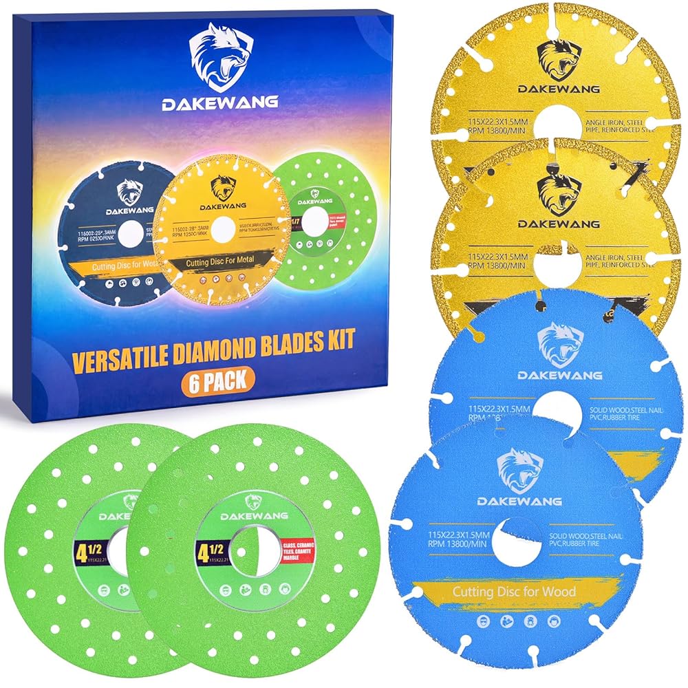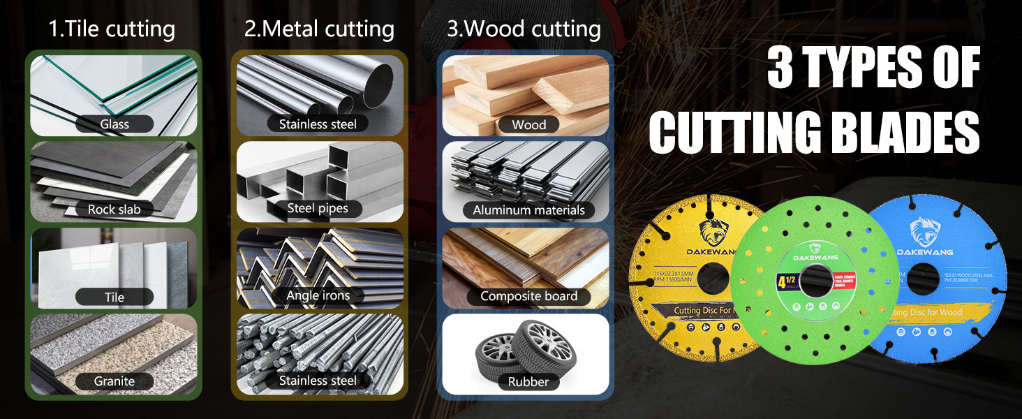 مجموعة شفرات الماس 3 في 1: تتضمن هذه المجموعة 3 أنواع من عجلة قطع الماس. النوع الأول يستخدم لقطع القضبان الفولاذية والفولاذ المقاوم للصدأ والحديد الزهر والمعادن الأخرى، والنوع الثاني يستخدم لقطع الألواح الصخرية والبلاط والرخام والزجاج. النوع الثالث يستخدم لقطع الخشب، مواد الألمنيوم، PVC، الألواح المركبة، المطاط، إلخ.