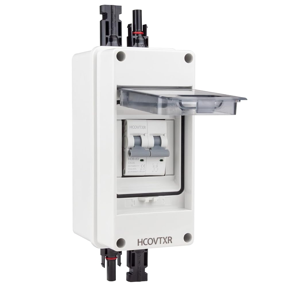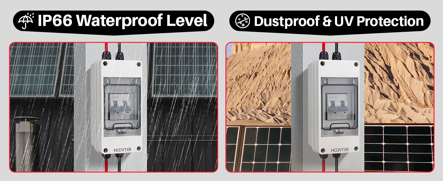 صندوق قواطع تيار مستمر مقاوم للطقس IP65: غلاف متين من البولي كربونات + ABS يوفر قوة عالية التأثير، وحماية من الأشعة فوق البنفسجية، ومقاومة للحرارة، ومثبطات اللهب للتركيبات الشمسية الخارجية والسطحية